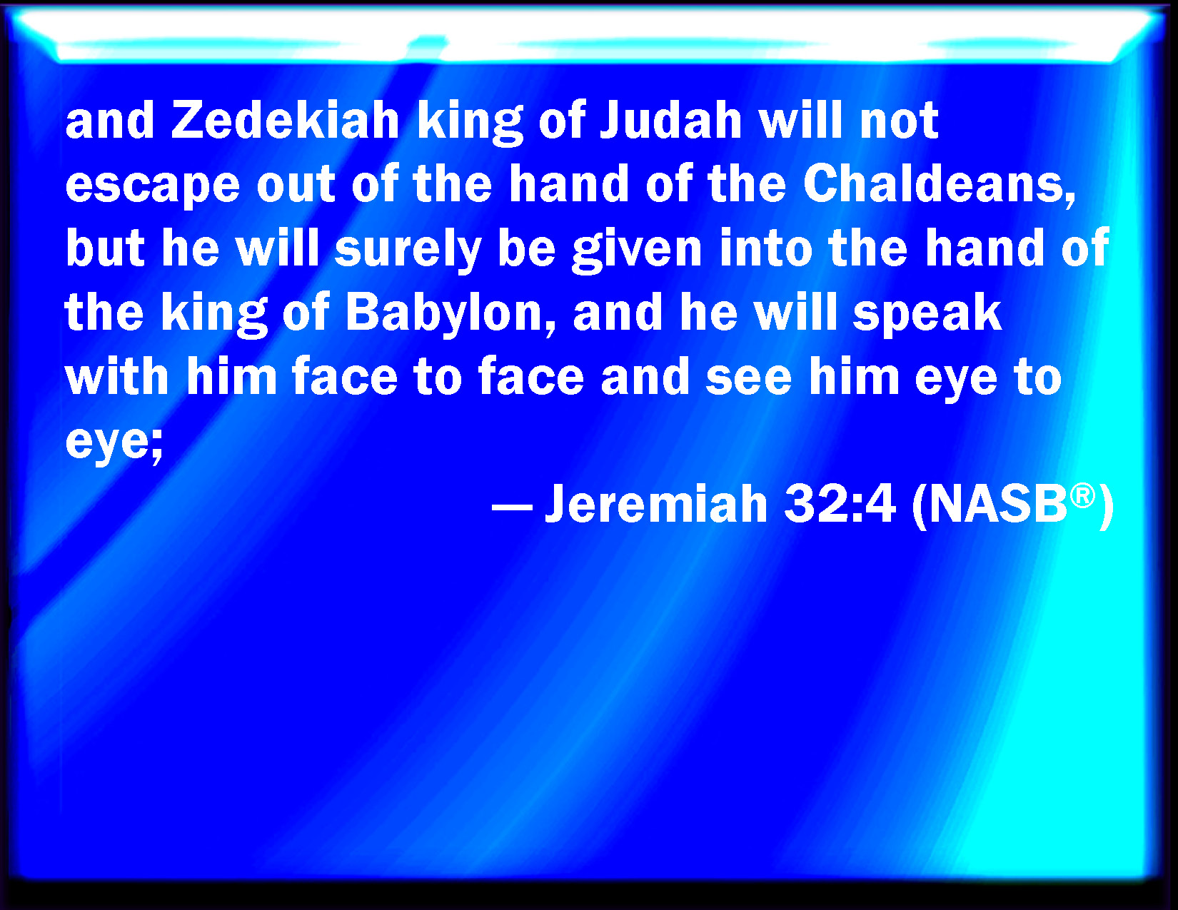 Bible Verse Slide Jeremiah 32:4 And Zedekiah king of Judah shall not escape out of the hand of the Chaldeans, but shall surely be delivered into the hand of the king of Babylon, and shall speak with him mouth to mouth, and his eyes shall behold his eyes; KJV: And Zedekiah king of Judah shall not escape out of the hand of the Chaldeans, but shall surely be delivered into the hand of the king of Babylon, and shall speak with him mouth to mouth, and his eyes shall behold his eyes; DRB: And Sedecias king of Juda shall not escape out of the hand of the Chaldeans: but he shall be delivered into the hands of the king of Babylon: and he shall speak to him mouth to mouth, and his eyes shall see his eyes. DBT: and Zedekiah king of Judah shall not escape out of the hand of the Chaldeans; for he shall certainly be given into the hand of the king of Babylon, and shall speak with him mouth to mouth, and his eyes shall behold his eyes; ERV: and Zedekiah king of Judah shall not escape out of the hand of the Chaldeans, but shall surely be delivered into the hand of the king of Babylon, and shall speak with him mouth to mouth, and his eyes shall behold his eyes; WBT: And Zedekiah king of Judah shall not escape from the hand of the Chaldeans, but shall surely be delivered into the hand of the king of Babylon, and shall speak with him mouth to mouth, and his eyes shall behold his eyes; WEB: and Zedekiah king of Judah shall not escape out of the hand of the Chaldeans, but shall surely be delivered into the hand of the king of Babylon, and shall speak with him mouth to mouth, and his eyes shall see his eyes; YLT: And Zedekiah king of Judah doth not escape out of the hand of the Chaldeans, but is certainly given into the hand of the king of Babylon, and his mouth hath spoken with his mouth, and his eyes see his eyes,Links Jeremiah 32:4 NIV • Jeremiah 32:4 NLT • Jeremiah 32:4 ESV • Jeremiah 32:4 NASB • Jeremiah 32:4 KJV • Jeremiah 32:4 Interlinear • Jeremiah 32:4 Commentaries • Jeremiah 32:4 Parallel Texts • Jeremiah 32:4 Bible Apps • Jeremiah 32:4 Parallel • Bible Hub |