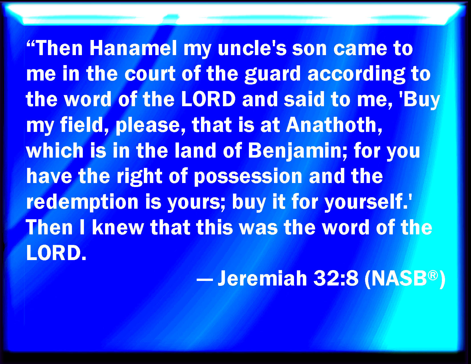 Bible Verse Slide Jeremiah 32:8 So Hanameel my uncle's son came to me in the court of the prison according to the word of the LORD, and said to me, Buy my field, I pray you, that is in Anathoth, which is in the country of Benjamin: for the right of inheritance is yours, and the redemption is yours; buy it for yourself. Then I knew that this was the word of the LORD. KJV: So Hanameel mine uncle's son came to me in the court of the prison according to the word of the LORD, and said unto me, Buy my field, I pray thee, that is in Anathoth, which is in the country of Benjamin: for the right of inheritance is thine, and the redemption is thine; buy it for thyself. Then I knew that this was the word of the LORD. DRB: And Hanameel my uncle's son cam to me, according to the word of the to the entry of the prison, and said me: Buy my held, which is in in the land of Benjamin: for the right of inheritance is thins, and thou art next of kin to possess it. And I understood this was the word of the Lord. DBT: And Hanameel, mine uncle's son, came to me in the court of the guard according to the word of Jehovah, and said unto me, Buy my field, I pray thee, that is in Anathoth, which is in the land of Benjamin; for the right of inheritance is thine, and the redemption is thine: buy it for thyself. Then I knew that this was the word of Jehovah. ERV: So Hanamel mine uncle's son came to me in the court of the guard according to the word of the LORD, and said unto me, Buy my field, I pray thee, that is in Anathoth, which is in the land of Benjamin: for the right of inheritance is thine, and the redemption is thine; buy it for thyself. Then I knew that this was the word of the LORD. WBT: So Hanameel my uncle's son came to me in the court of the prison, according to the word of the LORD, and said to me, Buy my field, I pray thee, that is in Anathoth, which is in the country of Benjamin: for the right of inheritance is thine, and the redemption is thine; buy it for thyself. Then I knew that this was the word of the LORD. WEB: So Hanamel my uncle's son came to me in the court of the guard according to the word of Yahweh, and said to me, Please buy my field that is in Anathoth, which is in the land of Benjamin; for the right of inheritance is yours, and the redemption is yours; buy it for yourself. Then I knew that this was the word of Yahweh. YLT: And Hanameel, my uncle's son, cometh in unto me, according to the word of Jehovah, unto the court of the prison, and saith unto me, 'Buy, I pray thee, my field that is in Anathoth, that is in the land of Benjamin, for thine is the right of possession, and thine of redemption — buy for thee.' And I know that it is the word of Jehovah,Links Jeremiah 32:8 NIV • Jeremiah 32:8 NLT • Jeremiah 32:8 ESV • Jeremiah 32:8 NASB • Jeremiah 32:8 KJV • Jeremiah 32:8 Interlinear • Jeremiah 32:8 Commentaries • Jeremiah 32:8 Parallel Texts • Jeremiah 32:8 Bible Apps • Jeremiah 32:8 Parallel • Bible Hub |