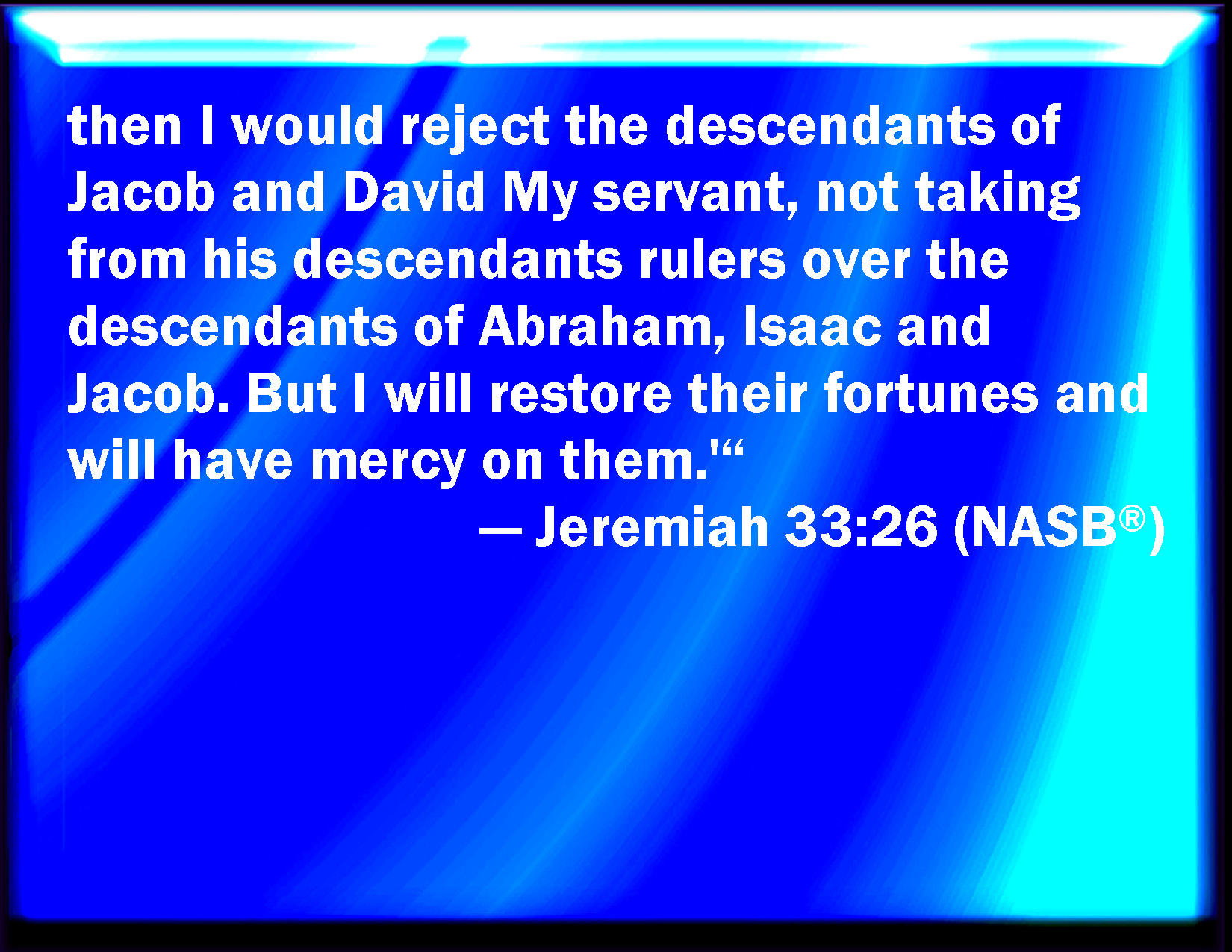 Bible Verse Slide Jeremiah 33:26 Then will I cast away the seed of Jacob and David my servant, so that I will not take any of his seed to be rulers over the seed of Abraham, Isaac, and Jacob: for I will cause their captivity to return, and have mercy on them. KJV: Then will I cast away the seed of Jacob, and David my servant, so that I will not take any of his seed to be rulers over the seed of Abraham, Isaac, and Jacob: for I will cause their captivity to return, and have mercy on them. DRB: Surely I will also cast; off the seed of Jacob, and of David my servant, so as not to take any of his seed to be rulers of the seed of Abraham, Isaac, and Jacob: for I will bring back their captivity, and will have mercy on them. DBT: then will I also cast away the seed of Jacob, and of David my servant, so as not to take of his seed to be rulers over the seed of Abraham, Isaac, and Jacob: for I will turn their captivity, and will have mercy on them. ERV: then will I also cast away the seed of Jacob, and of David my servant, so that I will not take of his seed to be rulers over the seed of Abraham, Isaac, and Jacob: for I will cause their captivity to return, and will have mercy on them. WBT: Then will I cast away the seed of Jacob, and David my servant, so that I will not take any of his seed to be rulers over the seed of Abraham, Isaac, and Jacob; for I will cause their captivity to return, and have mercy on them. WEB: then will I also cast away the seed of Jacob, and of David my servant, so that I will not take of his seed to be rulers over the seed of Abraham, Isaac, and Jacob: for I will cause their captivity to return, and will have mercy on them. YLT: Also the seed of Jacob, and David My servant, I reject, Against taking from his seed rulers For the seed of Abraham, Isaac, and Jacob, For I turn back to their captivity, and have pitied them.'Links Jeremiah 33:26 NIV • Jeremiah 33:26 NLT • Jeremiah 33:26 ESV • Jeremiah 33:26 NASB • Jeremiah 33:26 KJV • Jeremiah 33:26 Interlinear • Jeremiah 33:26 Commentaries • Jeremiah 33:26 Parallel Texts • Jeremiah 33:26 Bible Apps • Jeremiah 33:26 Parallel • Bible Hub |