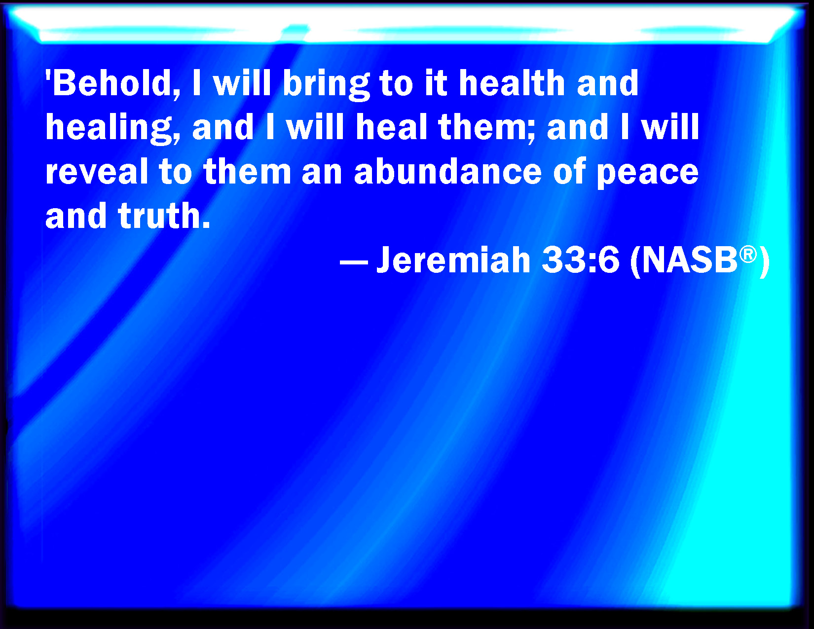 Bible Verse Slide Jeremiah 33:6 Behold, I will bring it health and cure, and I will cure them, and will reveal to them the abundance of peace and truth. KJV: Behold, I will bring it health and cure, and I will cure them, and will reveal unto them the abundance of peace and truth. DRB: Behold I will close their wounds and give them health, and I will cure them: and I will reveal to them the prayer of peace and truth. DBT: Behold, I will apply a healing dressing to it and cure, and I will heal them, and will reveal unto them an abundance of peace and truth. ERV: Behold, I will bring it health and cure, and I will cure them; and I will reveal unto them abundance of peace and truth. WBT: Behold, I will bring it health and cure, and I will cure them, and will reveal to them the abundance of peace and truth. WEB: Behold, I will bring it health and cure, and I will cure them; and I will reveal to them abundance of peace and truth. YLT: Lo, I am increasing to it health and cure, And have healed them, and revealed to them The abundance of peace and truth.Links Jeremiah 33:6 NIV • Jeremiah 33:6 NLT • Jeremiah 33:6 ESV • Jeremiah 33:6 NASB • Jeremiah 33:6 KJV • Jeremiah 33:6 Interlinear • Jeremiah 33:6 Commentaries • Jeremiah 33:6 Parallel Texts • Jeremiah 33:6 Bible Apps • Jeremiah 33:6 Parallel • Bible Hub |