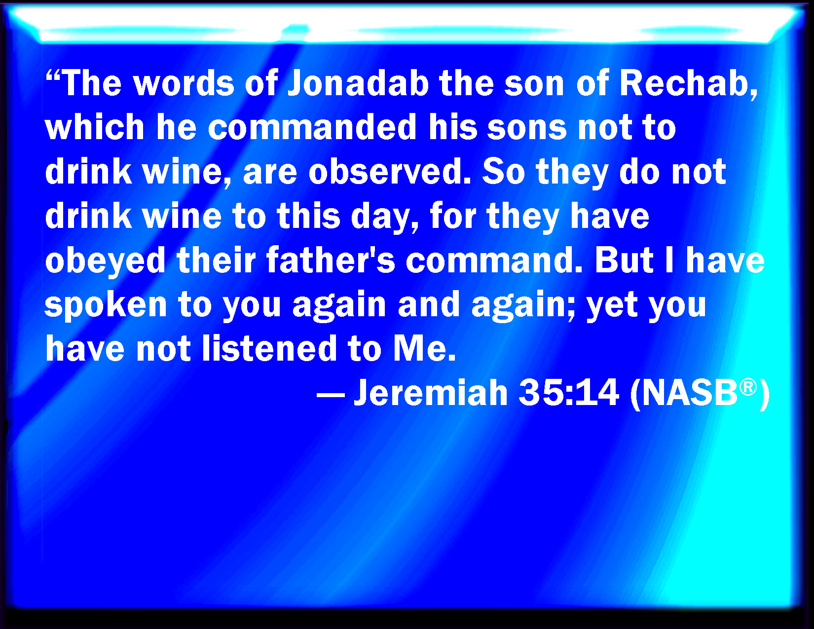 Bible Verse Slide Jeremiah 35:14 The words of Jonadab the son of Rechab, that he commanded his sons not to drink wine, are performed; for to this day they drink none, but obey their father's commandment: notwithstanding I have spoken to you, rising early and speaking; but you listened not to me. KJV: The words of Jonadab the son of Rechab, that he commanded his sons not to drink wine, are performed; for unto this day they drink none, but obey their father's commandment: notwithstanding I have spoken unto you, rising early and speaking; but ye hearkened not unto me. DRB: The words of Jonadab the son of Rechab, by which he commanded his sons not to drink wine, have prevailed: and they have drunk none to this day, because they have obeyed the commandment of their father: but I have spoken to you, rising early and speaking, and you have not obeyed me. DBT: The words of Jonadab the son of Rechab, that he commanded his sons not to drink wine, are performed; and to this day they have drunk none, for they have obeyed their father's commandment. But I have spoken unto you, rising early and speaking, and ye have not hearkened unto me. ERV: The words of Jonadab the son of Rechab, that he commanded his sons, not to drink wine, are performed, and unto this day they drink none, for they obey their father's commandment: but I have spoken unto you, rising up early and speaking; and ye have not hearkened unto me. WBT: The words of Jonadab the son of Rechab, that he commanded his sons not to drink wine, are performed; for to this day they drink none, but obey their father's commandment: notwithstanding I have spoken to you, rising early and speaking; but ye hearkened not to me. WEB: The words of Jonadab the son of Rechab, that he commanded his sons, not to drink wine, are performed; and to this day they drink none, for they obey their father's commandment: but I have spoken to you, rising up early and speaking; and you have not listened to me. YLT: Performed have been the words of Jonadab son of Rechab, when he commanded his sons not to drink wine, and they have not drunk unto this day, for they have obeyed the command of their father; and I — I have spoken unto you, rising early and speaking, and ye have not hearkened unto Me.Links Jeremiah 35:14 NIV • Jeremiah 35:14 NLT • Jeremiah 35:14 ESV • Jeremiah 35:14 NASB • Jeremiah 35:14 KJV • Jeremiah 35:14 Interlinear • Jeremiah 35:14 Commentaries • Jeremiah 35:14 Parallel Texts • Jeremiah 35:14 Bible Apps • Jeremiah 35:14 Parallel • Bible Hub |