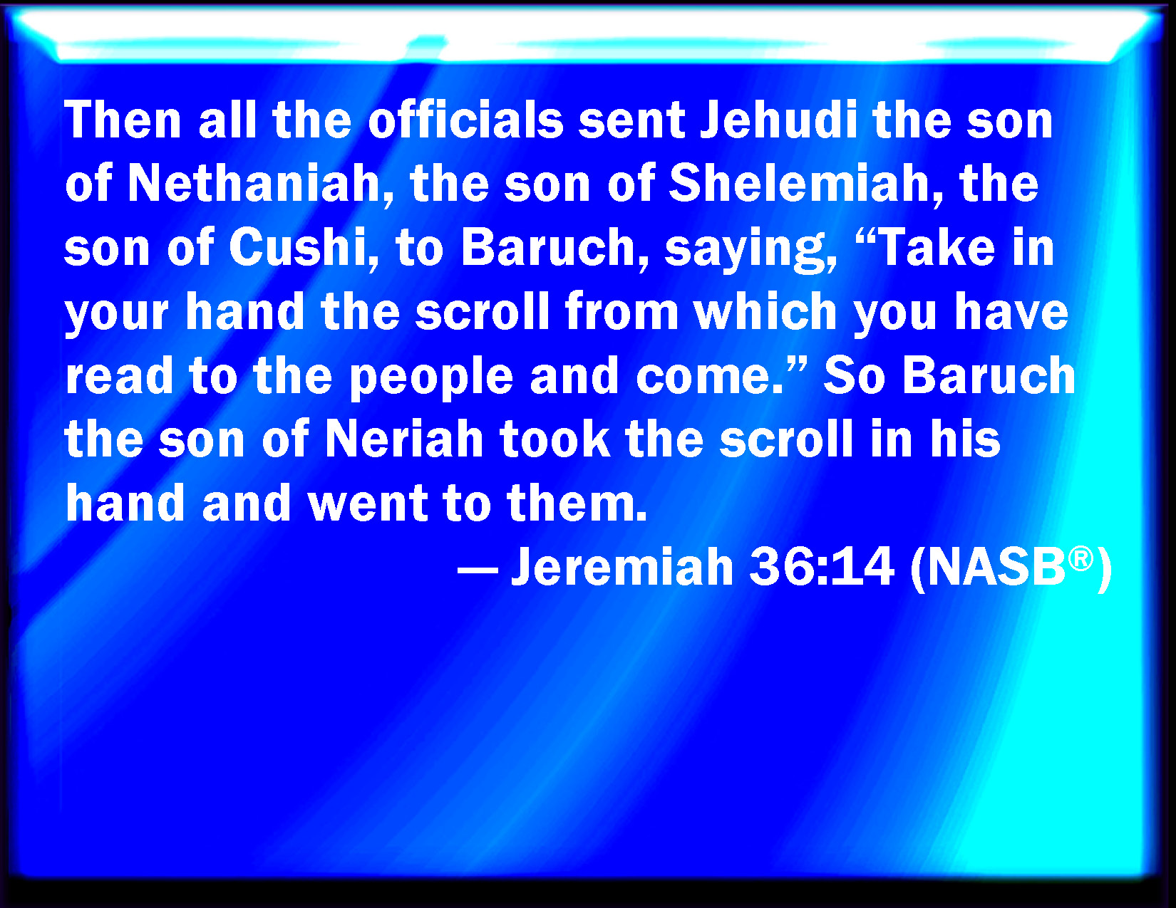 WBT:  Therefore all the princes sent Jehudi the son of Nethaniah, the son of Shelemiah, the son of Cushi, to Baruch, saying, Take in thy hand the roll in which thou hast read in the ears of the people, and come. So Baruch the son of Neriah took the roll in his hand, and came to them.