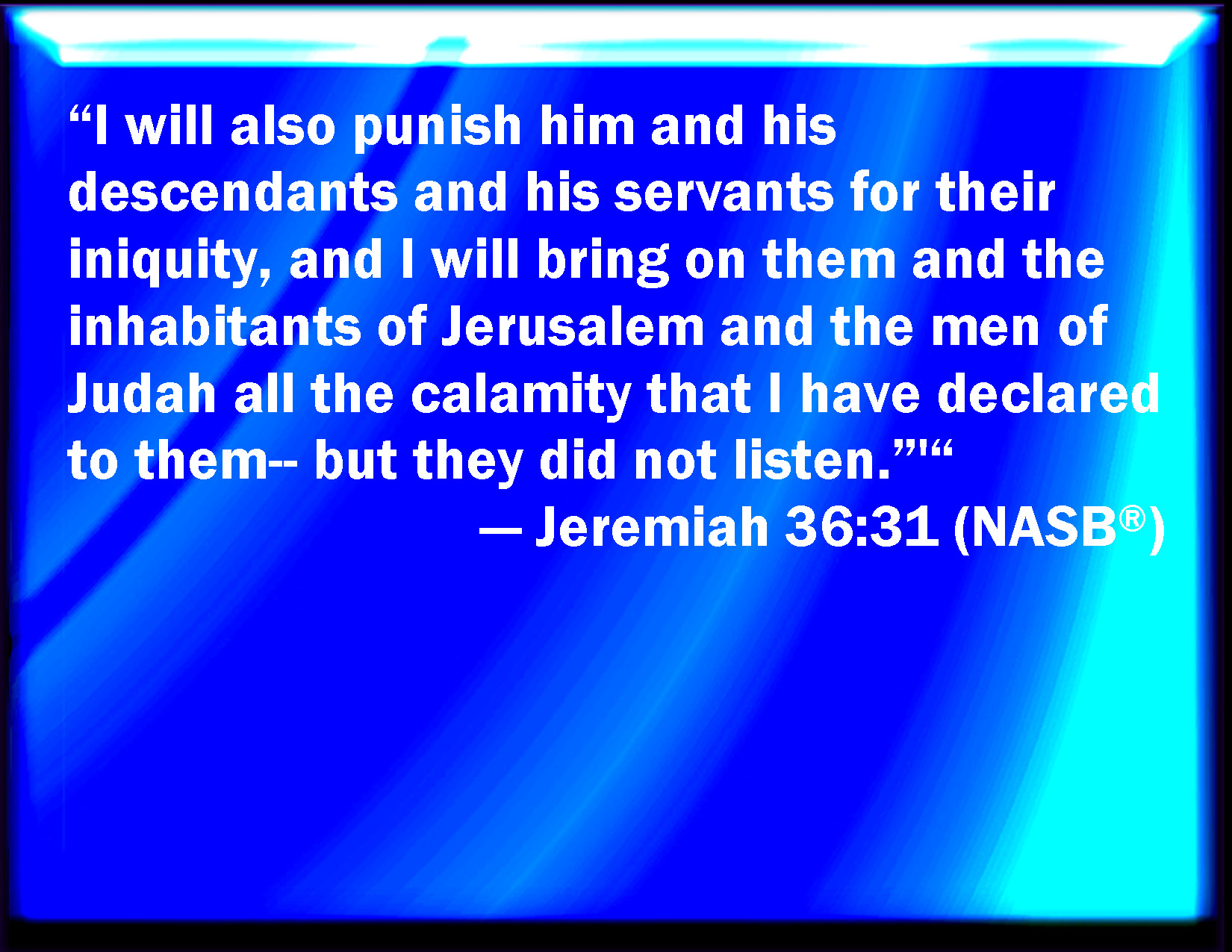 Bible Verse Slide Jeremiah 36:31 And I will punish him and his seed and his servants for their iniquity; and I will bring on them, and on the inhabitants of Jerusalem, and on the men of Judah, all the evil that I have pronounced against them; but they listened not. KJV: And I will punish him and his seed and his servants for their iniquity; and I will bring upon them, and upon the inhabitants of Jerusalem, and upon the men of Judah, all the evil that I have pronounced against them; but they hearkened not. DRB: And I will punish him, and his seed and his servants, for their iniquities, and I will bring upon them, and upon the inhabitants of Jerusalem, and upon the men of Juda all the evil that I have pronounced against them, but they have not heard. DBT: And I will visit their iniquity upon him, and upon his seed, and upon his servants; and I will bring upon them, and upon the inhabitants of Jerusalem, and upon the men of Judah, all the evil that I have pronounced against them; and they have not hearkened. ERV: And I will punish him and his seed and his servants for their iniquity; and I will bring upon them, and upon the inhabitants of Jerusalem, and upon the men of Judah, all the evil that I have pronounced against them, but they hearkened not. WBT: And I will punish him and his seed and his servants for their iniquity; and I will bring upon them, and upon the inhabitants of Jerusalem, and upon the men of Judah, all the evil that I have pronounced against them; but they hearkened not. WEB: I will punish him and his seed and his servants for their iniquity; and I will bring on them, and on the inhabitants of Jerusalem, and on the men of Judah, all the evil that I have pronounced against them, but they didn't listen. YLT: and I have charged on him, and on his seed, and on his servants, their iniquity; and I have brought in on them, and on the inhabitants of Jerusalem, and unto the men of Judah, all the evil that I have spoken unto them, and they hearkened not.'Links Jeremiah 36:31 NIV • Jeremiah 36:31 NLT • Jeremiah 36:31 ESV • Jeremiah 36:31 NASB • Jeremiah 36:31 KJV • Jeremiah 36:31 Interlinear • Jeremiah 36:31 Commentaries • Jeremiah 36:31 Parallel Texts • Jeremiah 36:31 Bible Apps • Jeremiah 36:31 Parallel • Bible Hub |