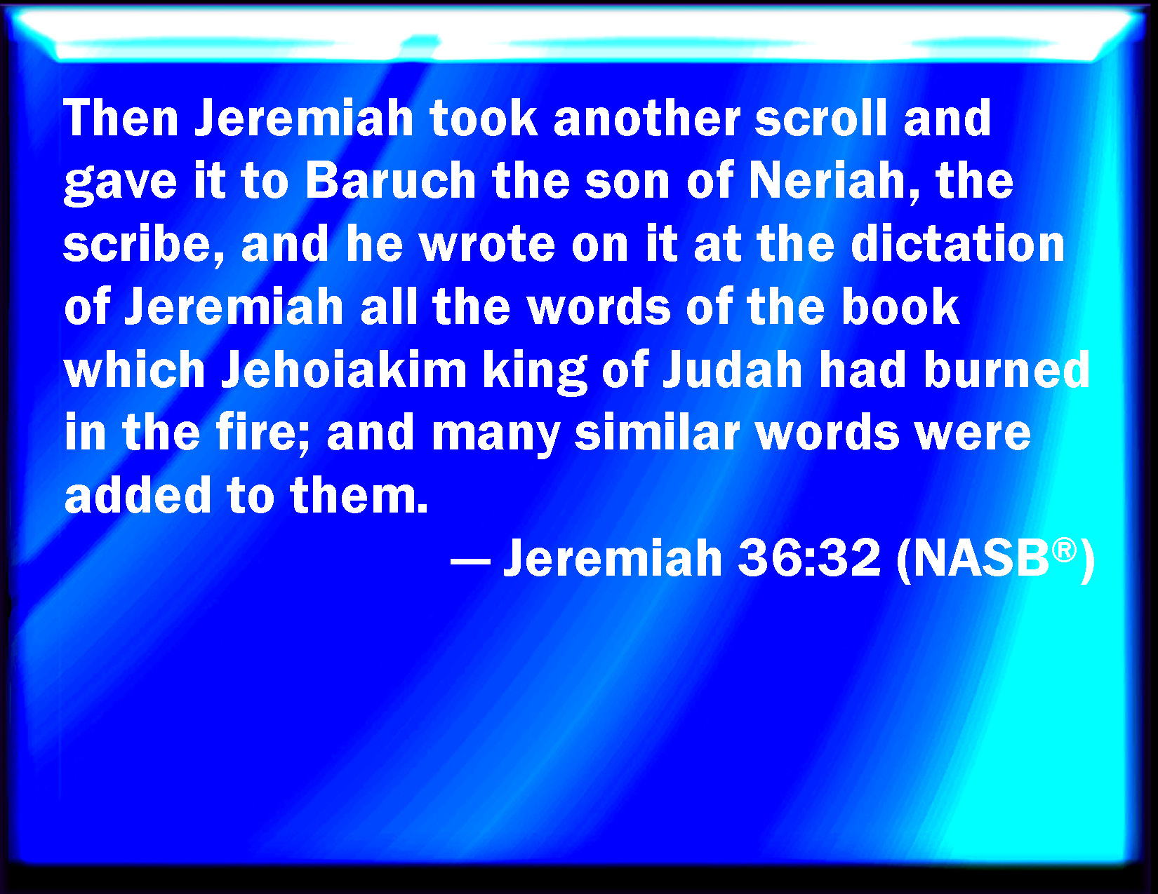 Then took Jeremiah another roll, and gave it to Baruch the scribe, the son of Neriah; who wrote therein from the mouth of Jeremiah all the words of the book which Jehoiakim king of Judah had burned in the fire: and there were added besides unto them many like words.