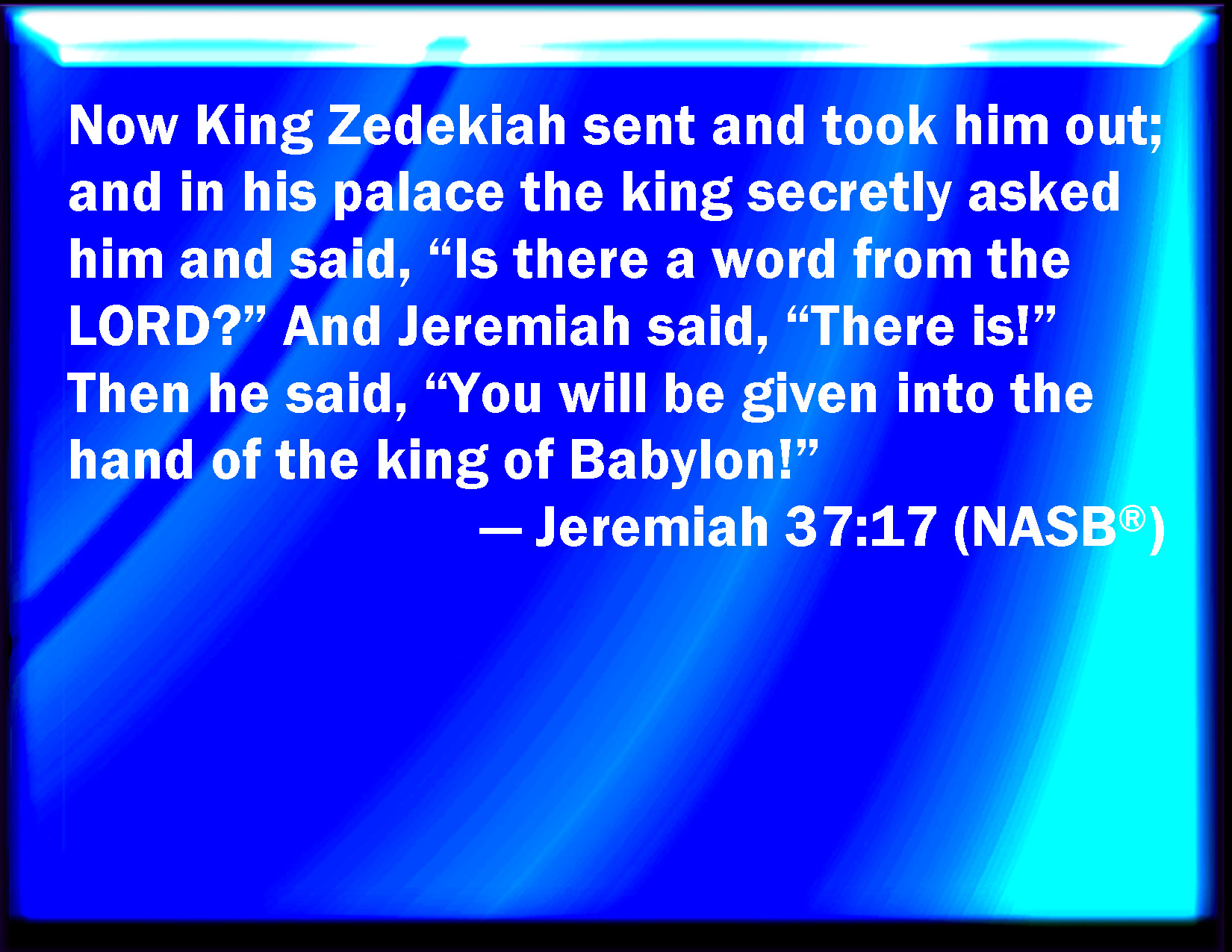 Bible Verse Slide Jeremiah 37:17 Then Zedekiah the king sent, and took him out: and the king asked him secretly in his house, and said, Is there any word from the LORD? And Jeremiah said, There is: for, said he, you shall be delivered into the hand of the king of Babylon. KJV: Then Zedekiah the king sent, and took him out: and the king asked him secretly in his house, and said, Is there any word from the LORD? And Jeremiah said, There is: for, said he, thou shalt be delivered into the hand of the king of Babylon. DRB: Then Sedecias the king, sending, took him: and asked him secretly in his house, and said: Is there, thinkest thou, any word from the Lord? And Jeremias said: There is. And he said: Thou shalt be delivered into the hands of the king of Babylon. DBT: king Zedekiah sent and took him out. And the king asked of him secretly in his house, and said, Is there any word from Jehovah? And Jeremiah said, There is; and he said, Thou shalt be given into the hand of the king of Babylon. ERV: Then Zedekiah the king sent, and fetched him: and the king asked him secretly in his house, and said, Is there any word from the LORD? And Jeremiah said, There is. He said also, Thou shalt be delivered into the hand of the king of Babylon. WBT: Then Zedekiah the king sent, and took him out: and the king asked him secretly in his house, and said, Is there any word from the LORD? And Jeremiah said, There is: for, said he, thou shalt be delivered into the hand of the king of Babylon. WEB: Then Zedekiah the king sent, and fetched him: and the king asked him secretly in his house, and said, Is there any word from Yahweh? Jeremiah said, There is. He said also, You shall be delivered into the hand of the king of Babylon. YLT: and the king Zedekiah sendeth, and taketh him, and the king asketh him in his house in secret, and saith, 'Is there a word from Jehovah?' And Jeremiah saith, 'There is,' and he saith, 'Into the hand of the king of Babylon thou art given.'Links Jeremiah 37:17 NIV • Jeremiah 37:17 NLT • Jeremiah 37:17 ESV • Jeremiah 37:17 NASB • Jeremiah 37:17 KJV • Jeremiah 37:17 Interlinear • Jeremiah 37:17 Commentaries • Jeremiah 37:17 Parallel Texts • Jeremiah 37:17 Bible Apps • Jeremiah 37:17 Parallel • Bible Hub |