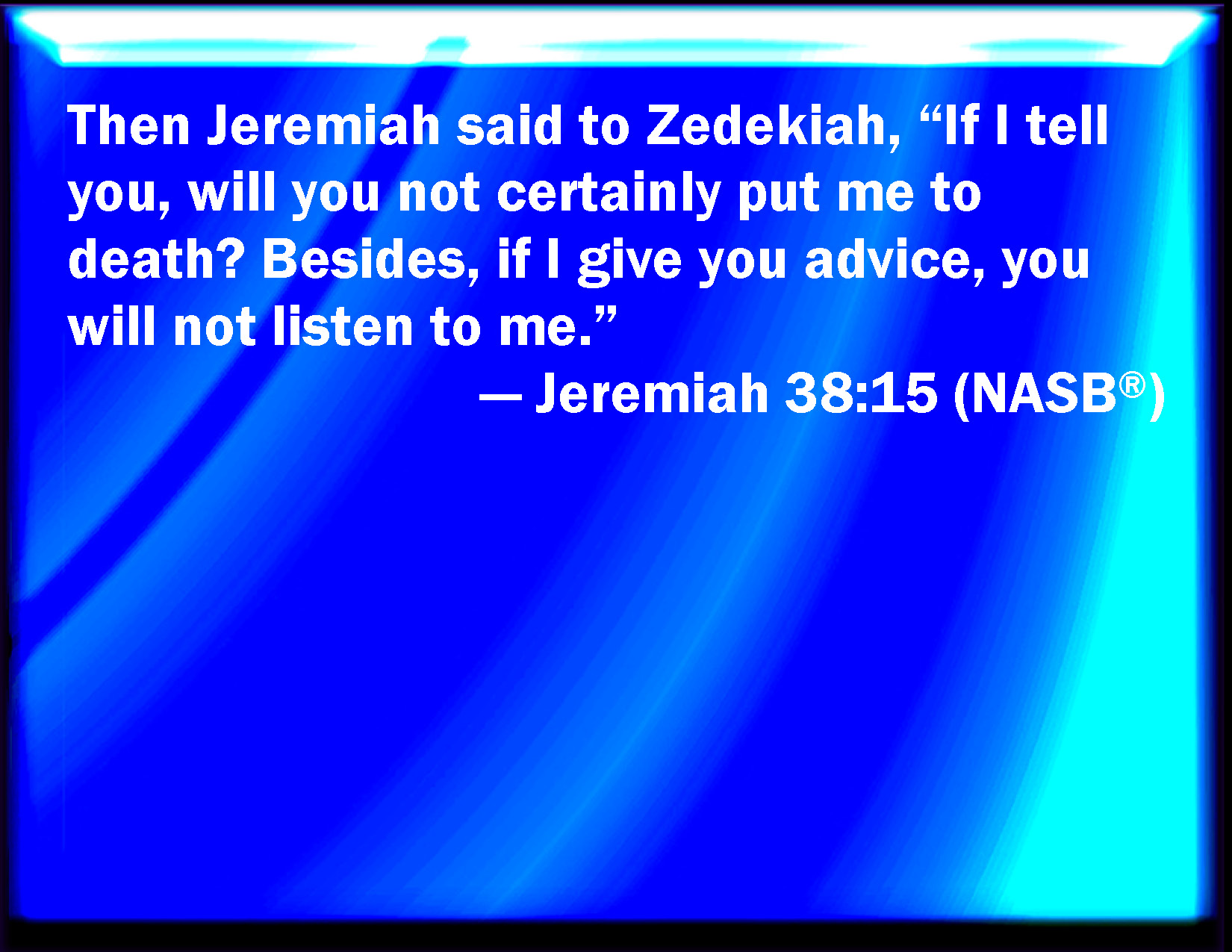 Bible Verse Slide Jeremiah 38:15 Then Jeremiah said to Zedekiah, If I declare it to you, will you not surely put me to death? and if I give you counsel, will you not listen to me? KJV: Then Jeremiah said unto Zedekiah, If I declare it unto thee, wilt thou not surely put me to death? and if I give thee counsel, wilt thou not hearken unto me? DRB: Then Jeremias said to Sedecias: If I shall declare it to thee, wilt thou not put me to death? and if I give thee counsel, thou wilt not hearken to me. DBT: And Jeremiah said unto Zedekiah, If I declare it unto thee, wilt thou not certainly put me to death? and if I give thee counsel, thou wilt not hearken unto me. ERV: Then Jeremiah said unto Zedekiah, If I declare it unto thee, wilt thou not surely put me to death? and if I give thee counsel, thou wilt not hearken unto me. WBT: Then Jeremiah said to Zedekiah, If I declare it to thee, wilt thou not surely put me to death? and if I give thee counsel, wilt thou not hearken to me? WEB: Then Jeremiah said to Zedekiah, If I declare it to you, will you not surely put me to death? and if I give you counsel, you will not listen to me. YLT: And Jeremiah saith unto Zedekiah, 'When I declare to thee, dost thou not surely put me to death? and when I counsel thee, thou dost not hearken unto me.'Links Jeremiah 38:15 NIV • Jeremiah 38:15 NLT • Jeremiah 38:15 ESV • Jeremiah 38:15 NASB • Jeremiah 38:15 KJV • Jeremiah 38:15 Interlinear • Jeremiah 38:15 Commentaries • Jeremiah 38:15 Parallel Texts • Jeremiah 38:15 Bible Apps • Jeremiah 38:15 Parallel • Bible Hub |