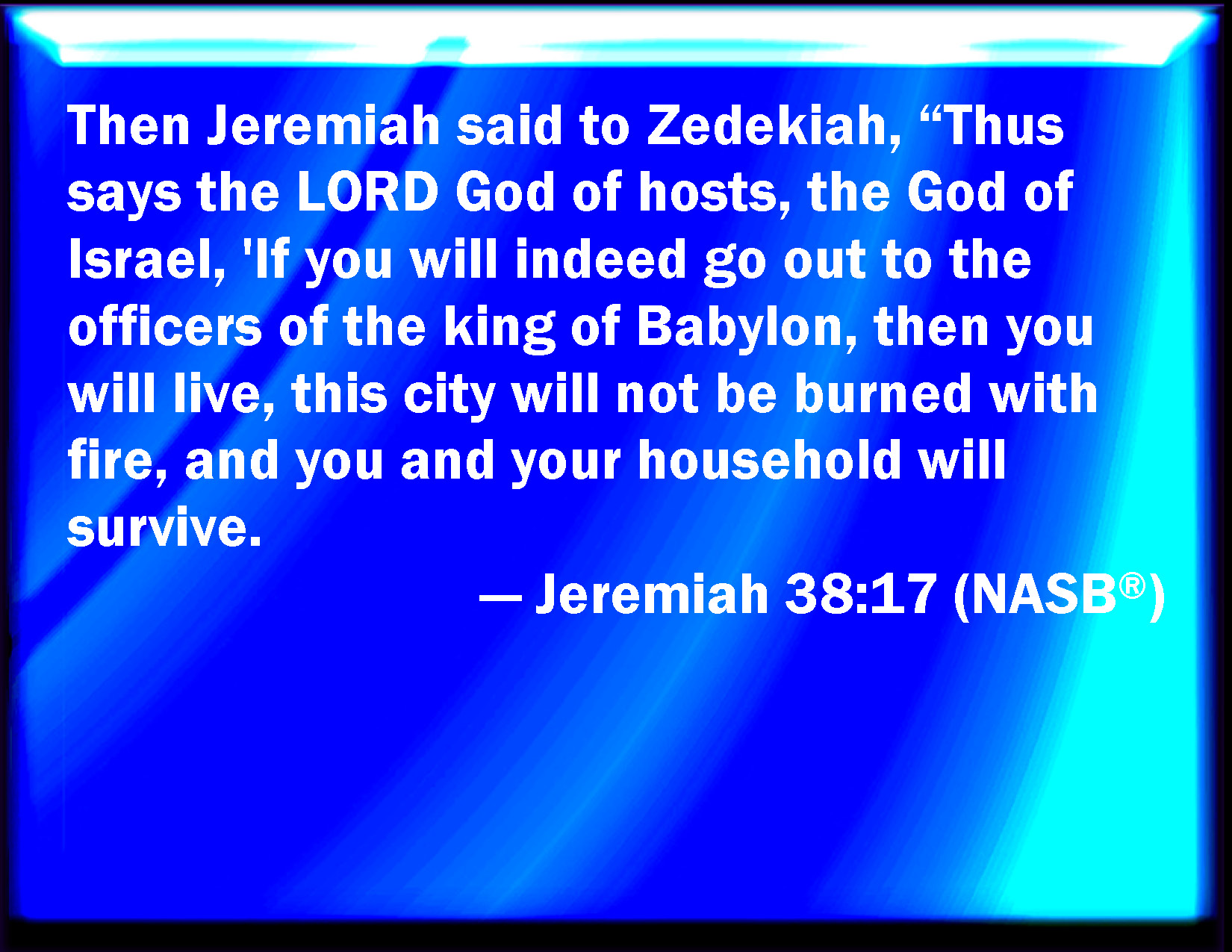 Bible Verse Slide Jeremiah 38:17 Then said Jeremiah to Zedekiah, Thus said the LORD, the God of hosts, the God of Israel; If you will assuredly go forth to the king of Babylon's princes, then your soul shall live, and this city shall not be burned with fire; and you shall live, and your house: KJV: Then said Jeremiah unto Zedekiah, Thus saith the LORD, the God of hosts, the God of Israel; If thou wilt assuredly go forth unto the king of Babylon's princes, then thy soul shall live, and this city shall not be burned with fire; and thou shalt live, and thine house: DRB: And Jeremias said to Sedecias: Thus saith the Lord of hosts the God of Israel: If thou wilt take a resolution and go out to the princes of the king of Babylon, thy soul shall live, and this city shall not be burnt with fire: and thou shalt be safe, and thy house. DBT: And Jeremiah said unto Zedekiah, Thus saith Jehovah the God of hosts, the God of Israel: If thou wilt freely go forth to the king of Babylon's princes, then thy soul shall live, and this city shall not be burned with fire; and thou shalt live, and thy house. ERV: Then said Jeremiah unto Zedekiah, Thus saith the LORD, the God of hosts, the God of Israel: If thou wilt go forth unto the king of Babylon's princes, then thy soul shall live, and this city shall not be burned with fire; and thou shalt live, and thine house: WBT: Then said Jeremiah to Zedekiah, Thus saith the LORD, the God of hosts, the God of Israel; If thou wilt assuredly go forth to the king of Babylon's princes, then thy soul shall live, and this city shall not be burned with fire; and thou shalt live, and thy house: WEB: Then Jeremiah said to Zedekiah, Thus says Yahweh, the God of Armies, the God of Israel: If you will go forth to the king of Babylon's princes, then your soul shall live, and this city shall not be burned with fire; and you shall live, and your house. YLT: And Jeremiah saith unto Zedekiah, 'Thus said Jehovah, God of Hosts, God of Israel: If thou dost certainly go forth unto the heads of the king of Babylon, then hath thy soul lived, and this city is not burned with fire, yea, thou hast lived, thou and thy house.Links Jeremiah 38:17 NIV • Jeremiah 38:17 NLT • Jeremiah 38:17 ESV • Jeremiah 38:17 NASB • Jeremiah 38:17 KJV • Jeremiah 38:17 Interlinear • Jeremiah 38:17 Commentaries • Jeremiah 38:17 Parallel Texts • Jeremiah 38:17 Bible Apps • Jeremiah 38:17 Parallel • Bible Hub |