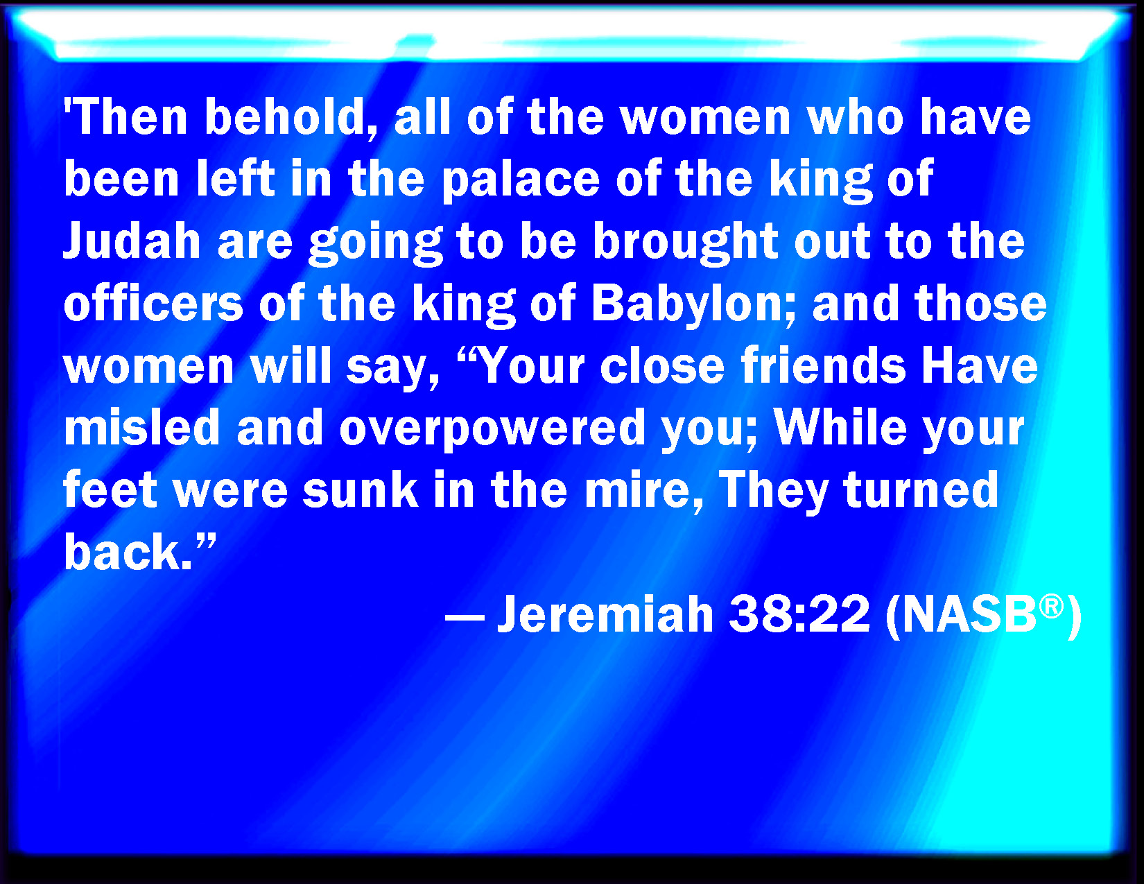 Bible Verse Slide Jeremiah 38:22 And, behold, all the women that are left in the king of Judah's house shall be brought forth to the king of Babylon's princes, and those women shall say, Your friends have set you on, and have prevailed against you: your feet are sunk in the mire, and they are turned away back. KJV: And, behold, all the women that are left in the king of Judah's house shall be brought forth to the king of Babylon's princes, and those women shall say, Thy friends have set thee on, and have prevailed against thee: thy feet are sunk in the mire, and they are turned away back. DRB: Behold all the women that are left in the house of the king of Juda, shall be brought out to the princes of the king of Babylon: and they shall say: Thy men of peace have deceived thee, and have prevailed against thee, they have plunged thy feet in the mire, and in a slippery place, and they have departed from thee. DBT: Behold, all the women that are left in the king of Judah's house shall be brought forth to the king of Babylon's princes; and they shall say, Thy familiar friends have set thee on, and have prevailed over thee; thy feet are sunk in the mire, they are turned away back. ERV: behold, all the women that are left in the king of Judah's house shall be brought forth to the king of Babylon's princes, and those women shall say, Thy familiar friends have set thee on, and have prevailed over thee: now that thy feet are sunk in the mire: they are turned away back. WBT: And behold, all the women that are left in the king of Judah's house shall be brought forth to the king of Babylon's princes, and those women shall say, Thy friends have set thee on, and have prevailed against thee: thy feet are sunk in the mire, and they are turned away back. WEB: behold, all the women who are left in the king of Judah's house shall be brought forth to the king of Babylon's princes, and those women shall say, Your familiar friends have set you on, and have prevailed over you: [now that] your feet are sunk in the mire, they are turned away back. YLT: That, lo, all the women who have been left in the house of the king of Judah are brought forth unto the heads of the king of Babylon, and lo, they are saying: Persuaded thee, and prevailed against thee, Have thine allies, Sunk into mire have thy feet, They have been turned backward.Links Jeremiah 38:22 NIV • Jeremiah 38:22 NLT • Jeremiah 38:22 ESV • Jeremiah 38:22 NASB • Jeremiah 38:22 KJV • Jeremiah 38:22 Interlinear • Jeremiah 38:22 Commentaries • Jeremiah 38:22 Parallel Texts • Jeremiah 38:22 Bible Apps • Jeremiah 38:22 Parallel • Bible Hub |