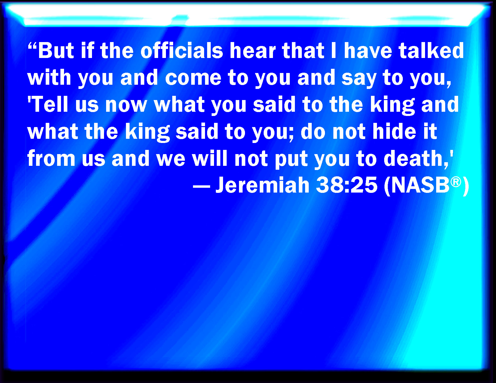 Bible Verse Slide Jeremiah 38:25 But if the princes hear that I have talked with you, and they come to you, and say to you, Declare to us now what you have said to the king, hide it not from us, and we will not put you to death; also what the king said to you: KJV: But if the princes hear that I have talked with thee, and they come unto thee, and say unto thee, Declare unto us now what thou hast said unto the king, hide it not from us, and we will not put thee to death; also what the king said unto thee: DRB: But if the princes shall hear that I have spoken with thee, and shall come to thee, and say to thee: Tell us what thou hast said to the king, hide it not from us, and we will not kill thee: and also what the king said to thee: DBT: And if the princes hear that I have talked with thee, and they come unto thee, and say unto thee, Declare unto us now what thou hast said unto the king, hide it not from us, and we will not put thee to death; and what hath the king said unto thee? ERV: But if the princes hear that I have talked with thee, and they come unto thee, and say unto thee, Declare unto us now what thou hast said unto the king; hide it not from us, and we will not put thee to death: also what the king said unto thee: WBT: But if the princes hear that I have talked with thee, and they come to thee, and say to thee, Declare to us now what thou hast said to the king, hide it not from us, and we will not put thee to death; also what the king said to thee: WEB: But if the princes hear that I have talked with you, and they come to you, and tell you, Declare to us now what you have said to the king; don't hide it from us, and we will not put you to death; also what the king said to you: YLT: and when the heads hear that I have spoken with thee, and they have come in unto thee, and have said unto thee, Declare to us, we pray thee, what thou didst speak unto the king, do not hide it from us, and we do not put thee to death, and what the king spake unto thee,Links Jeremiah 38:25 NIV • Jeremiah 38:25 NLT • Jeremiah 38:25 ESV • Jeremiah 38:25 NASB • Jeremiah 38:25 KJV • Jeremiah 38:25 Interlinear • Jeremiah 38:25 Commentaries • Jeremiah 38:25 Parallel Texts • Jeremiah 38:25 Bible Apps • Jeremiah 38:25 Parallel • Bible Hub |