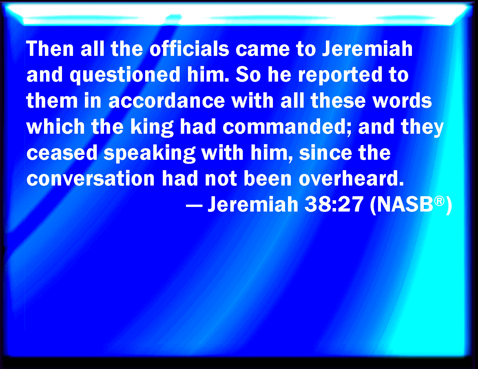 Bible Verse Slide Jeremiah 38:27 Then came all the princes to Jeremiah, and asked him: and he told them according to all these words that the king had commanded. So they left off speaking with him; for the matter was not perceived. KJV: Then came all the princes unto Jeremiah, and asked him: and he told them according to all these words that the king had commanded. So they left off speaking with him; for the matter was not perceived. DRB: So all the princes came to Jeremias, and asked him: and he spoke to them according to all the words that the king had commanded him: and they left him: for nothing had been heard. DBT: And all the princes came to Jeremiah, and asked him; and he told them according to all these words that the king had commanded. And they withdrew quietly from him; for the matter was not reported. ERV: Then came all the princes unto Jeremiah, and asked him: and he told them according to all these words that the king had commanded. So they left off speaking with him; for the matter was not perceived. WBT: Then came all the princes to Jeremiah, and asked him: and he told them according to all these words that the king had commanded. So they left off speaking with him; for the matter was not perceived. WEB: Then came all the princes to Jeremiah, and asked him; and he told them according to all these words that the king had commanded. So they left off speaking with him; for the matter was not perceived. YLT: And all the heads come in unto Jeremiah, and ask him, and he declareth to them according to all these words that the king commanded, and they keep silent from him, for the matter was not heard;Links Jeremiah 38:27 NIV • Jeremiah 38:27 NLT • Jeremiah 38:27 ESV • Jeremiah 38:27 NASB • Jeremiah 38:27 KJV • Jeremiah 38:27 Interlinear • Jeremiah 38:27 Commentaries • Jeremiah 38:27 Parallel Texts • Jeremiah 38:27 Bible Apps • Jeremiah 38:27 Parallel • Bible Hub |