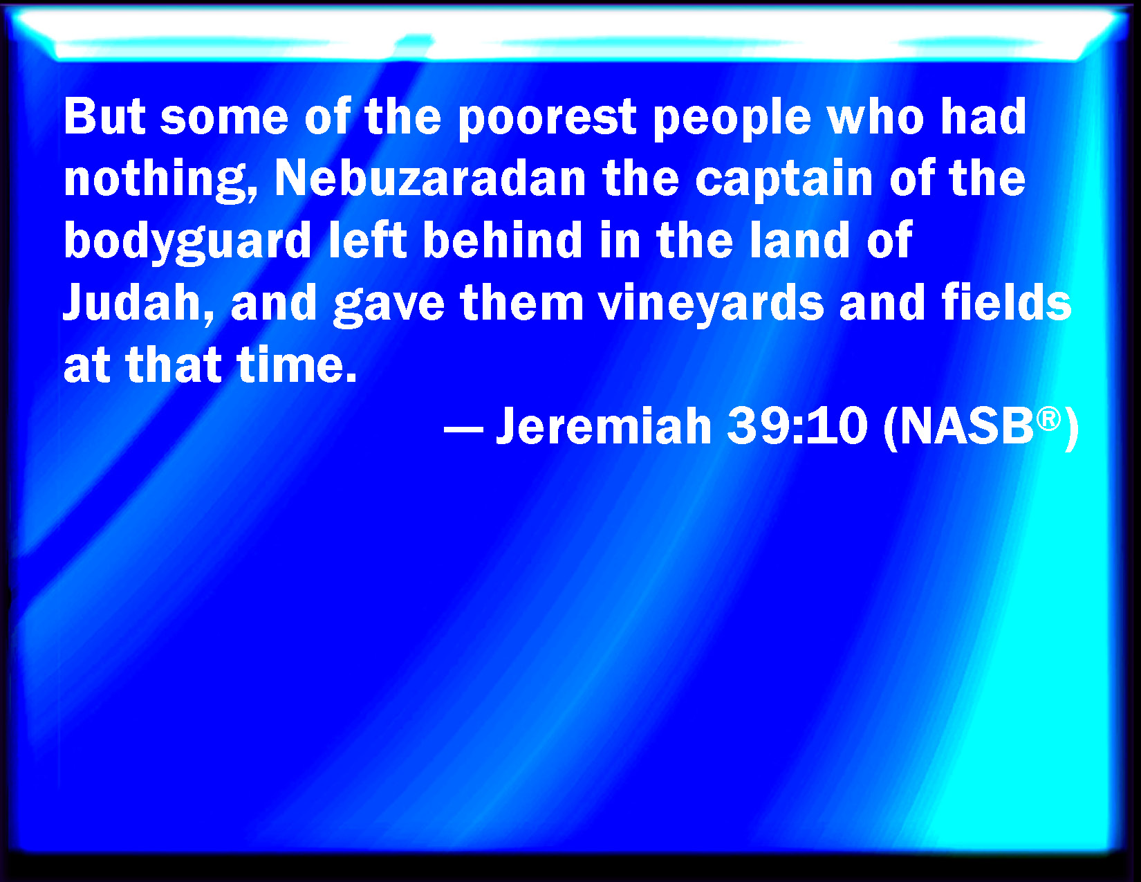 Bible Verse Slide Jeremiah 39:10 But Nebuzaradan the captain of the guard left of the poor of the people, which had nothing, in the land of Judah, and gave them vineyards and fields at the same time. KJV: But Nebuzaradan the captain of the guard left of the poor of the people, which had nothing, in the land of Judah, and gave them vineyards and fields at the same time. DRB: But Nabuzardan the general left some of the poor people that had nothing at all, in the land of Juda, and he gave them vineyards, and cisterns at that time. DBT: But Nebuzar-adan the captain of the body-guard left certain of the people, the poor who had nothing, in the land of Judah, and gave them vineyards and fields at the same time. ERV: But Nebuzaradan the captain of the guard left of the poor of the people, which had nothing, in the land of Judah, and gave them vineyards and fields at the same time. WBT: But Nebuzar-adan the captain of the guard left of the poor of the people, who had nothing, in the land of Judah, and gave them vineyards and fields at the same time. WEB: But Nebuzaradan the captain of the guard left of the poor of the people, who had nothing, in the land of Judah, and gave them vineyards and fields at the same time. YLT: And of the poor people, who have nothing, hath Nebuzar-Adan, chief of the executioners, left in the land of Judah, and he giveth to them vineyards and fields on the same day.Links Jeremiah 39:10 NIV • Jeremiah 39:10 NLT • Jeremiah 39:10 ESV • Jeremiah 39:10 NASB • Jeremiah 39:10 KJV • Jeremiah 39:10 Interlinear • Jeremiah 39:10 Commentaries • Jeremiah 39:10 Parallel Texts • Jeremiah 39:10 Bible Apps • Jeremiah 39:10 Parallel • Bible Hub |