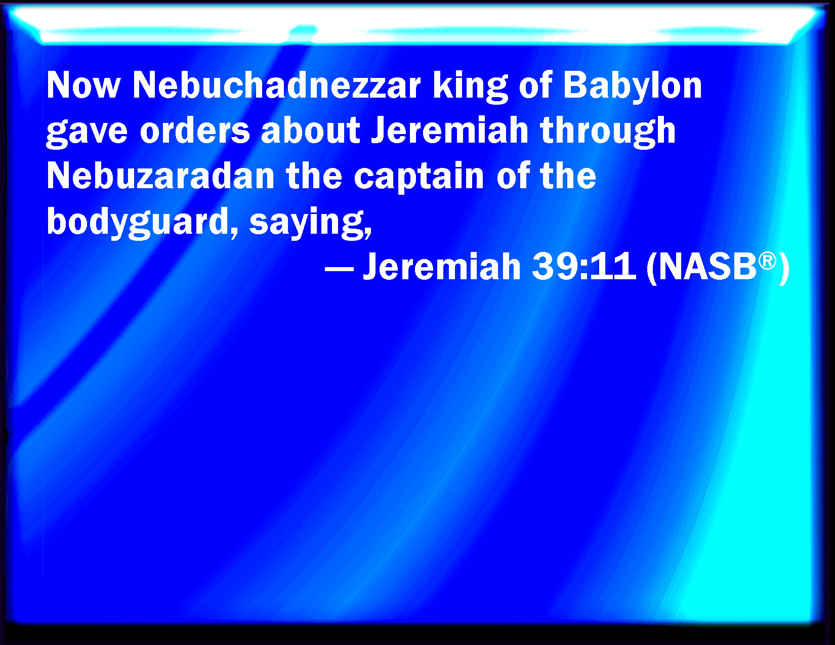 Bible Verse Slide Jeremiah 39:11 Now Nebuchadrezzar king of Babylon gave charge concerning Jeremiah to Nebuzaradan the captain of the guard, saying, KJV: Now Nebuchadrezzar king of Babylon gave charge concerning Jeremiah to Nebuzaradan the captain of the guard, saying, DRB: Now Nabuchodonosor king of Babylon had given charge to Nabuzardan the general concerning Jeremias, saying: DBT: And Nebuchadrezzar king of Babylon had given charge concerning Jeremiah by Nebuzar-adan the captain of the body-guard, saying, ERV: Now Nebuchadrezzar king of Babylon gave charge concerning Jeremiah to Nebuzaradan the captain of the guard, saying, WBT: Now Nebuchadrezzar king of Babylon gave charge concerning Jeremiah to Nebuzar-adan the captain of the guard, saying, WEB: Now Nebuchadnezzar king of Babylon commanded Nebuzaradan the captain of the guard concerning Jeremiah, saying, YLT: And Nebuchadrezzar king of Babylon giveth a charge concerning Jeremiah, by the hand of Nebuzar-Adan, chief of the executioners, saying,Links Jeremiah 39:11 NIV • Jeremiah 39:11 NLT • Jeremiah 39:11 ESV • Jeremiah 39:11 NASB • Jeremiah 39:11 KJV • Jeremiah 39:11 Interlinear • Jeremiah 39:11 Commentaries • Jeremiah 39:11 Parallel Texts • Jeremiah 39:11 Bible Apps • Jeremiah 39:11 Parallel • Bible Hub |