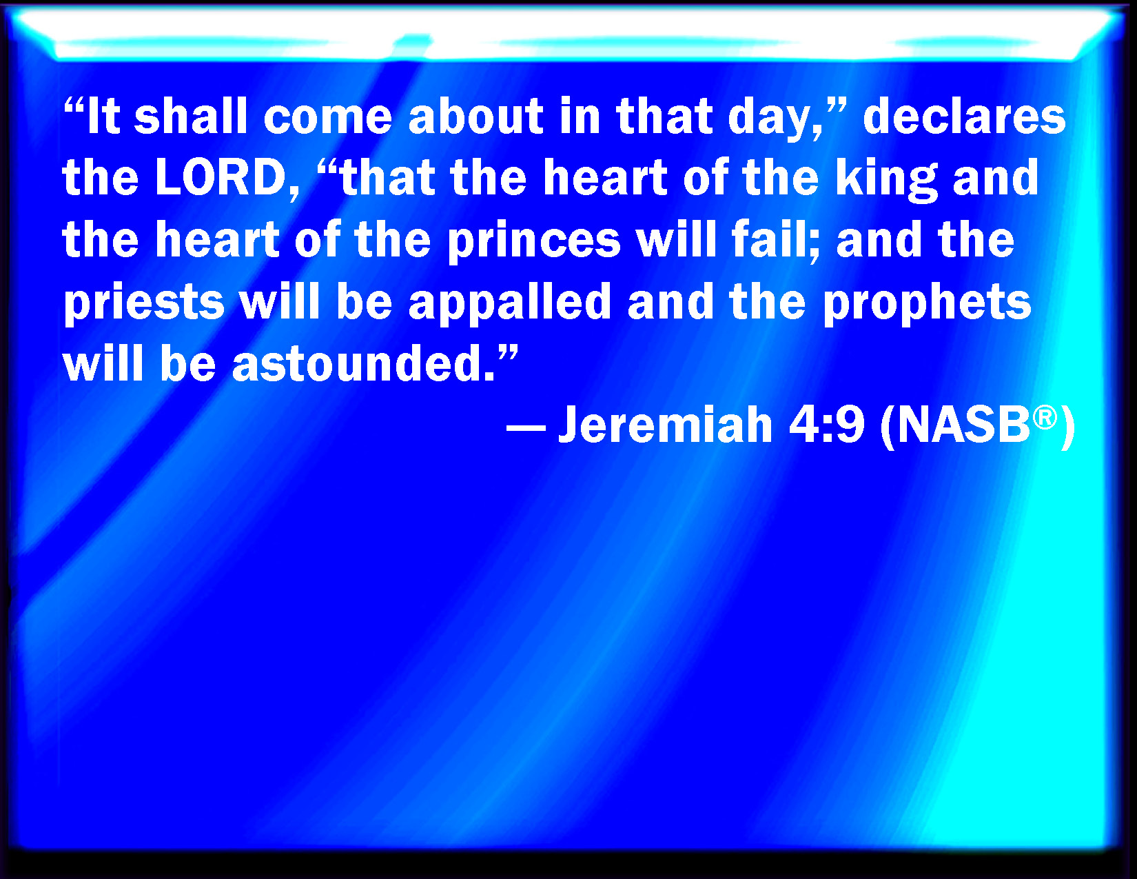 Bible Verse Slide Jeremiah 4:9 And it shall come to pass at that day, said the LORD, that the heart of the king shall perish, and the heart of the princes; and the priests shall be astonished, and the prophets shall wonder. KJV: And it shall come to pass at that day, saith the LORD, that the heart of the king shall perish, and the heart of the princes; and the priests shall be astonished, and the prophets shall wonder. DRB: And it shall come to pass in that day, saith the Lord: That the heart of the king shall perish, and the heart of the princes: and the priests shall be astonished, and the prophets shall be amazed DBT: And it shall come to pass in that day, saith Jehovah, that the heart of the king shall perish, and the heart of the princes; and the priests shall be astonished, and the prophets shall be amazed. ERV: And it shall come to pass at that day, saith the LORD, that the heart of the king shall perish, and the heart of the princes; and the priests shall be astonished, and the prophets shall wonder. WBT: And it shall come to pass at that day, saith the LORD, that the heart of the king shall perish, and the heart of the princes; and the priests shall be astonished, and the prophets shall wonder. WEB: "It shall happen at that day," says Yahweh, "that the heart of the king shall perish, and the heart of the princes; and the priests shall be astonished, and the prophets shall wonder." YLT: And it hath come to pass, in that day, An affirmation of Jehovah: 'Perish doth the heart of the king, And the heart of the princes, And astonished have been the priests, And the prophets do wonder.'Links Jeremiah 4:9 NIV • Jeremiah 4:9 NLT • Jeremiah 4:9 ESV • Jeremiah 4:9 NASB • Jeremiah 4:9 KJV • Jeremiah 4:9 Interlinear • Jeremiah 4:9 Commentaries • Jeremiah 4:9 Parallel Texts • Jeremiah 4:9 Bible Apps • Jeremiah 4:9 Parallel • Bible Hub |