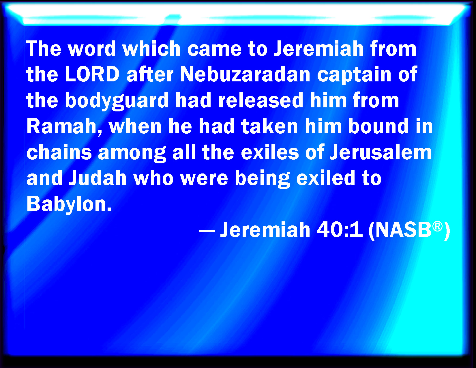 Bible Verse Slide Jeremiah 40:1 The word that came to Jeremiah from the LORD, after that Nebuzaradan the captain of the guard had let him go from Ramah, when he had taken him being bound in chains among all that were carried away captive of Jerusalem and Judah, which were carried away captive to Babylon. KJV: The word that came to Jeremiah from the LORD, after that Nebuzaradan the captain of the guard had let him go from Ramah, when he had taken him being bound in chains among all that were carried away captive of Jerusalem and Judah, which were carried away captive unto Babylon. DRB: The word that came to Jeremias from the Lord, after that Nabuzardan the general had let him go from Rama, when he had taken him, being bound with chains, among all them that were carried away from Jerusalem and Juda, and were carried to Babylon. DBT: The word that came to Jeremiah from Jehovah, after that Nebuzar-adan the captain of the body-guard had let him go from Ramah, when he had taken him, being bound in chains, among all the captivity of Jerusalem and Judah, that were carried away captive to Babylon. ERV: The word which came to Jeremiah from the LORD, after that Nebuzaradan the captain of the guard had let him go from Ramah, when he had taken him being bound in chains among all the captives of Jerusalem and Judah, which were carried away captive unto Babylon. WBT: The word which came to Jeremiah from the LORD, after that Nebuzar-adan the captain of the guard had let him go from Ramah, when he had taken him being bound in chains among all that were carried away captive of Jerusalem and Judah, who were carried away captive to Babylon. WEB: The word which came to Jeremiah from Yahweh, after that Nebuzaradan the captain of the guard had let him go from Ramah, when he had taken him being bound in chains among all the captives of Jerusalem and Judah, who were carried away captive to Babylon. YLT: The word that hath been unto Jeremiah from Jehovah, after Nebuzar-Adan, chief of the executioners, hath sent him from Ramah, in his taking him — and he a prisoner in chains — in the midst of all the removal of Jerusalem and of Judah, who are removed to Babylon.Links Jeremiah 40:1 NIV • Jeremiah 40:1 NLT • Jeremiah 40:1 ESV • Jeremiah 40:1 NASB • Jeremiah 40:1 KJV • Jeremiah 40:1 Interlinear • Jeremiah 40:1 Commentaries • Jeremiah 40:1 Parallel Texts • Jeremiah 40:1 Bible Apps • Jeremiah 40:1 Parallel • Bible Hub |