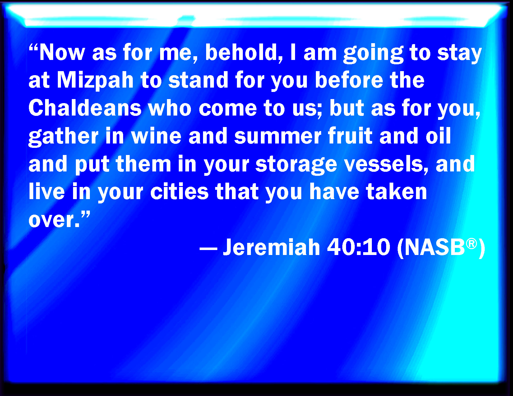 Bible Verse Slide Jeremiah 40:10 As for me, behold, I will dwell at Mizpah, to serve the Chaldeans, which will come to us: but you, gather you wine, and summer fruits, and oil, and put them in your vessels, and dwell in your cities that you have taken. KJV: As for me, behold, I will dwell at Mizpah to serve the Chaldeans, which will come unto us: but ye, gather ye wine, and summer fruits, and oil, and put them in your vessels, and dwell in your cities that ye have taken. DRB: Behold I dwell in Masphath, that I may answer the commandment of the Chaldeans that are sent to us: but as for you, gather ye the vintage, and the harvest, and the oil, and lay it up in your vessels, and abide in your cities which you hold. DBT: And as for me, behold, I dwell at Mizpah, to stand before the Chaldeans, who will come unto us; and ye, gather wine, and summer fruits, and oil, and put them in your vessels, and dwell in your cities which ye have taken. ERV: As for me, behold, I will dwell at Mizpah, to stand before the Chaldeans, which shall come unto us: but ye, gather ye wine and summer fruits and oil, and put them in your vessels, and dwell in your cities that ye have taken. WBT: As for me, behold, I will dwell at Mizpah, to serve the Chaldeans, who will come to us: but ye, gather ye wine, and summer fruits, and oil, and put them in your vessels, and dwell in your cities that ye have taken. WEB: As for me, behold, I will dwell at Mizpah, to stand before the Chaldeans who shall come to us: but you, gather wine and summer fruits and oil, and put them in your vessels, and dwell in your cities that you have taken. YLT: and I, lo, I am dwelling in Mizpah, to stand before the Chaldeans who are come in unto us, and ye, gather ye wine, and summer fruit, and oil, and put in your vessels, and dwell in your cities that ye have taken.'Links Jeremiah 40:10 NIV • Jeremiah 40:10 NLT • Jeremiah 40:10 ESV • Jeremiah 40:10 NASB • Jeremiah 40:10 KJV • Jeremiah 40:10 Interlinear • Jeremiah 40:10 Commentaries • Jeremiah 40:10 Parallel Texts • Jeremiah 40:10 Bible Apps • Jeremiah 40:10 Parallel • Bible Hub |