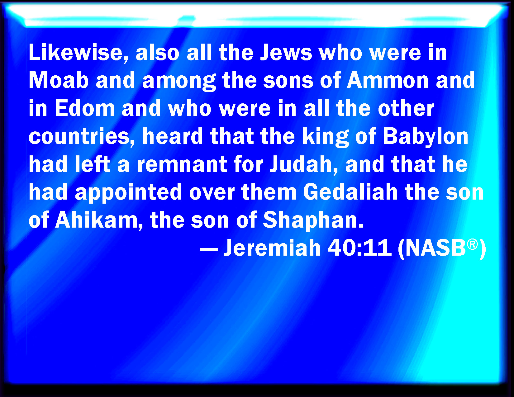 Bible Verse Slide Jeremiah 40:11 Likewise when all the Jews that were in Moab, and among the Ammonites, and in Edom, and that were in all the countries, heard that the king of Babylon had left a remnant of Judah, and that he had set over them Gedaliah the son of Ahikam the son of Shaphan; KJV: Likewise when all the Jews that were in Moab, and among the Ammonites, and in Edom, and that were in all the countries, heard that the king of Babylon had left a remnant of Judah, and that he had set over them Gedaliah the son of Ahikam the son of Shaphan; DRB: Moreover all the Jews that were in Moab, and among the children of Ammon, and in Edom, and in all the countries, when they heard that the king of Babylon had left a remnant in Judea, and that he had made Godolias the son of Ahicam the son of Saphan ruler over them: DBT: Likewise all the Jews that were in Moab, and among the children of Ammon and in Edom, and that were in all the lands, heard that the king of Babylon had left a remnant in Judah, and that he had appointed over them Gedaliah the son of Ahikam the son of Shaphan; ERV: Likewise when all the Jews that were in Moab, and among the children of Ammon, and in Edom, and that were in all the countries, heard that the king of Babylon had left a remnant of Judah, and that he had set over them Gedaliah the son of Ahikam, the son of Shaphan; WBT: Likewise when all the Jews that were in Moab, and among the Ammonites, and in Edom, and that were in all the countries, heard that the king of Babylon had left a remnant of Judah, and that he had set over them Gedaliah the son of Ahikam the son of Shaphan; WEB: Likewise when all the Jews who were in Moab, and among the children of Ammon, and in Edom, and who were in all the countries, heard that the king of Babylon had left a remnant of Judah, and that he had set over them Gedaliah the son of Ahikam, the son of Shaphan; YLT: And also all the Jews who are in Moab, and among the sons of Ammon, and in Edom, and who are in all the lands, have heard that the king of Babylon hath given a remnant to Judah, and that he hath appointed over them Gedaliah son of Ahikam, son of Shaphan,Links Jeremiah 40:11 NIV • Jeremiah 40:11 NLT • Jeremiah 40:11 ESV • Jeremiah 40:11 NASB • Jeremiah 40:11 KJV • Jeremiah 40:11 Interlinear • Jeremiah 40:11 Commentaries • Jeremiah 40:11 Parallel Texts • Jeremiah 40:11 Bible Apps • Jeremiah 40:11 Parallel • Bible Hub |