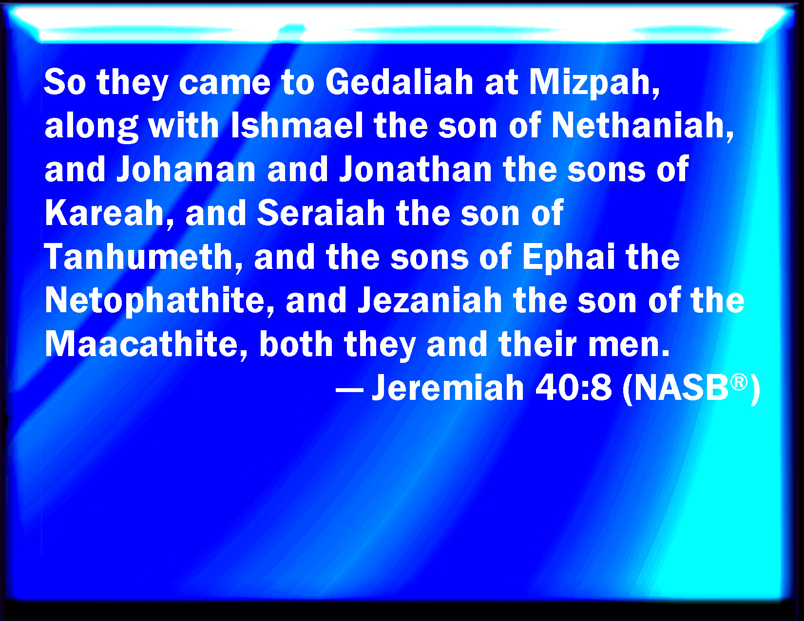 Bible Verse Slide Jeremiah 40:8 Then they came to Gedaliah to Mizpah, even Ishmael the son of Nethaniah, and Johanan and Jonathan the sons of Kareah, and Seraiah the son of Tanhumeth, and the sons of Ephai the Netophathite, and Jezaniah the son of a Maachathite, they and their men. KJV: Then they came to Gedaliah to Mizpah, even Ishmael the son of Nethaniah, and Johanan and Jonathan the sons of Kareah, and Seraiah the son of Tanhumeth, and the sons of Ephai the Netophathite, and Jezaniah the son of a Maachathite, they and their men. DRB: They came to Godolias to Masphath: and Ismahel the son of Nathanias, and Johanan, and Jonathan, the sons of Caree, and Sareas the son of Thanehumeth, and the children of Ophi, that were of Netophathi, and Jezonias the son of Maachati, they and their men. DBT: And they came to Gedaliah to Mizpah; even Ishmael the son of Nethaniah, and Johanan and Jonathan the sons of Kareah, and Seraiah the son of Tanhumeth, and the sons of Ephai the Netophathite, and Jezaniah the son of a Maachathite, they and their men. ERV: then they came to Gedaliah to Mizpah, even Ishmael the son of Nethaniah, and Johanan and Jonathan the sons of Kareah, and Seraiah the son of Tanhumeth, and the sons of Ephai the Netophathite, and Jezaniah the son of the Maacathite, they and their men. WBT: Then they came to Gedaliah to Mizpah, even Ishmael the son of Nethaniah, and Johanan and Jonathan the sons of Kareah, and Seraiah the son of Tanhumeth, and the sons of Ephai the Netophathite, and Jezaniah the son of a Maachathite, they and their men. WEB: then they came to Gedaliah to Mizpah, [to wit], Ishmael the son of Nethaniah, and Johanan and Jonathan the sons of Kareah, and Seraiah the son of Tanhumeth, and the sons of Ephai the Netophathite, and Jezaniah the son of the Maacathite, they and their men. YLT: and they come in unto Gedaliah to Mizpah, even Ishmael son of Nethaniah, and Johanan and Jonathan sons of Kareah, and Seraiah son of Tanhumeth, and the sons of Ephai the Netophathite, and Jezaniah son of the Maachathite, they and their men.Links Jeremiah 40:8 NIV • Jeremiah 40:8 NLT • Jeremiah 40:8 ESV • Jeremiah 40:8 NASB • Jeremiah 40:8 KJV • Jeremiah 40:8 Interlinear • Jeremiah 40:8 Commentaries • Jeremiah 40:8 Parallel Texts • Jeremiah 40:8 Bible Apps • Jeremiah 40:8 Parallel • Bible Hub |