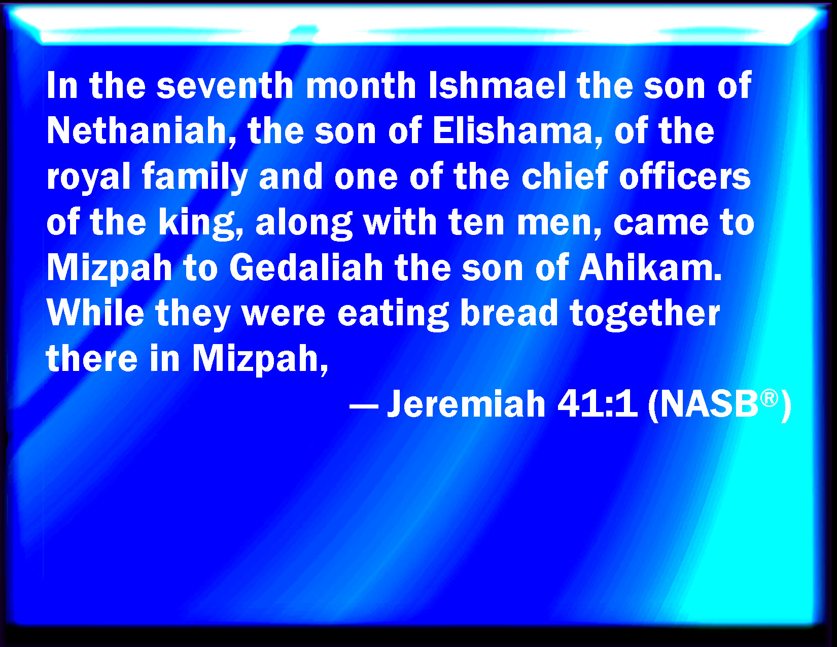 Bible Verse Slide Jeremiah 41:1 Now it came to pass in the seventh month, that Ishmael the son of Nethaniah the son of Elishama, of the seed royal, and the princes of the king, even ten men with him, came to Gedaliah the son of Ahikam to Mizpah; and there they did eat bread together in Mizpah. KJV: Now it came to pass in the seventh month, that Ishmael the son of Nethaniah the son of Elishama, of the seed royal, and the princes of the king, even ten men with him, came unto Gedaliah the son of Ahikam to Mizpah; and there they did eat bread together in Mizpah. DRB: And it came to pass in the seventh month, that Ismahel the son of Nathanias, the son of Elisama of the royal blood, and the nobles of the king, and ten men with him, came to Godolias the son of Ahicam into Masphath: and they ate bread there together in Masphath. DBT: And it came to pass in the seventh month, that Ishmael the son of Nethaniah the son of Elishama, of the royal seed, and one of the king's chief men, and ten men with him, came to Gedaliah the son of Ahikam unto Mizpah, and there they ate bread together, in Mizpah. ERV: Now it came to pass in the seventh month, that Ishmael the son of Nethaniah, the son of Elishama, of the seed royal, and one of the chief officers of the king, and ten men with him, came unto Gedaliah the son of Ahikam to Mizpah; and there they did eat bread together in Mizpah. WBT: Now it came to pass in the seventh month, that Ishmael the son of Nethaniah the son of Elishama, of the seed royal, and the princes of the king, even ten men with him, came to Gedaliah the son of Ahikam to Mizpah; and there they ate bread together in Mizpah. WEB: Now it happened in the seventh month, that Ishmael the son of Nethaniah, the son of Elishama, of the seed royal and [one of] the chief officers of the king, and ten men with him, came to Gedaliah the son of Ahikam to Mizpah; and there they ate bread together in Mizpah. YLT: And it cometh to pass, in the seventh month, come hath Ishmael son of Nethaniah, son of Elishama, of the seed royal, and of the chiefs of the king, and ten men with him, unto Gedaliah son of Ahikam, to Mizpah, and they eat there bread together in Mizpah.Links Jeremiah 41:1 NIV • Jeremiah 41:1 NLT • Jeremiah 41:1 ESV • Jeremiah 41:1 NASB • Jeremiah 41:1 KJV • Jeremiah 41:1 Interlinear • Jeremiah 41:1 Commentaries • Jeremiah 41:1 Parallel Texts • Jeremiah 41:1 Bible Apps • Jeremiah 41:1 Parallel • Bible Hub |