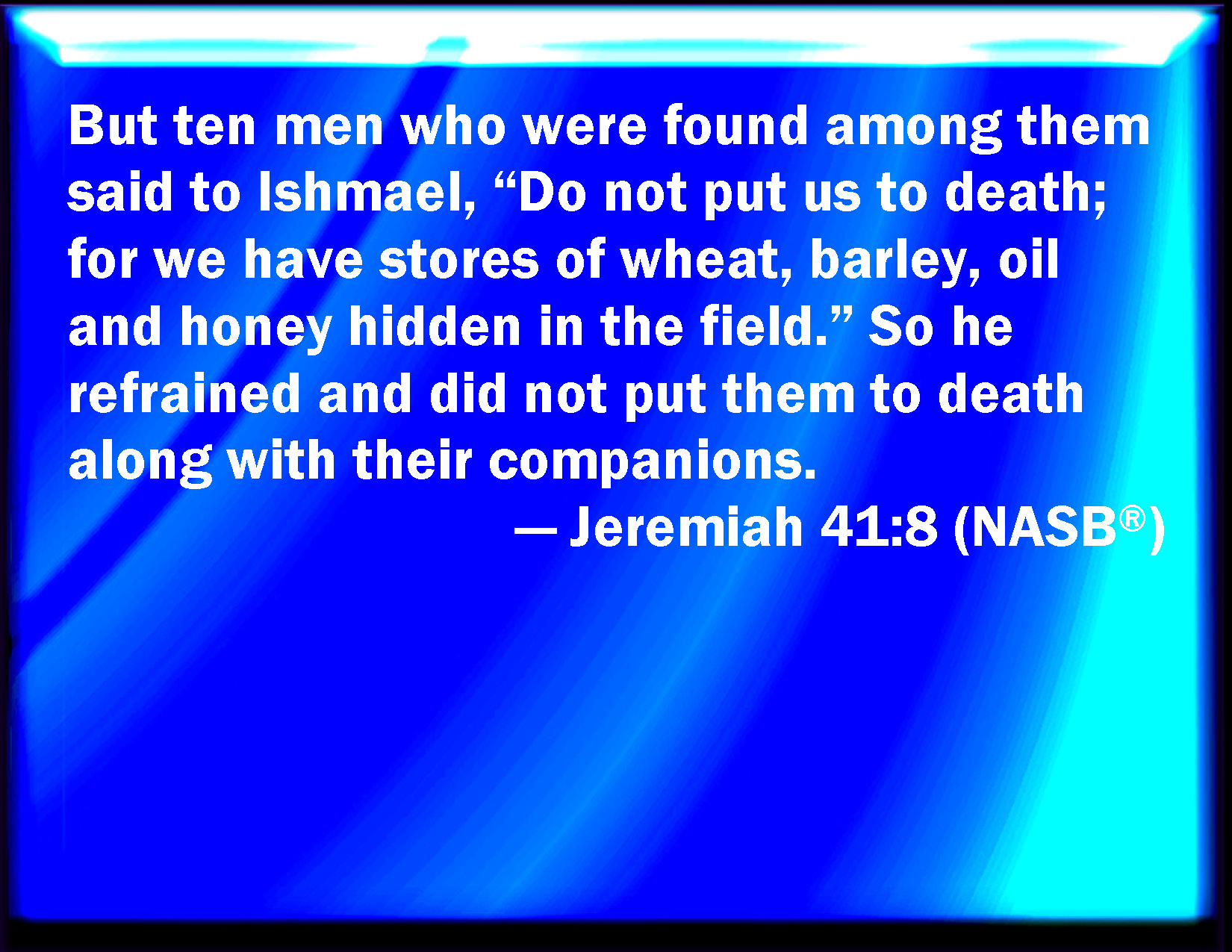 Bible Verse Slide Jeremiah 41:8 But ten men were found among them that said to Ishmael, Slay us not: for we have treasures in the field, of wheat, and of barley, and of oil, and of honey. So he declined, and slew them not among their brothers. KJV: But ten men were found among them that said unto Ishmael, Slay us not: for we have treasures in the field, of wheat, and of barley, and of oil, and of honey. So he forbare, and slew them not among their brethren. DRB: But ten men were found among them, that said to Ismahel : Kill us not: for we have stores in the field, of wheat, and barley, and oil, and honey. And he forbore, and slew them not with their brethren. DBT: But ten men were found among them that said unto Ishmael, Do not kill us, for we have hidden stores in the field, of wheat, and of barley, and of oil, and of honey. So he forbore, and did not kill them among their brethren. ERV: But ten men were found among them that said unto Ishmael, Slay us not: for we have stores hidden in the field, of wheat, and of barley, and of oil, and of honey. So he forbare, and slew them not among their brethren. WBT: But ten men were found among them that said to Ishmael, Slay us not: for we have treasures in the field, of wheat, and of barley, and of oil, and of honey. So he forbore, and slew them not among their brethren. WEB: But ten men were found among those who said to Ishmael, Don't kill us; for we have stores hidden in the field, of wheat, and of barley, and of oil, and of honey. So he stopped, and didn't kill them among their brothers. YLT: And ten men have been found among them, and they say unto Ishmael, 'Do not put us to death, for we have things hidden in the field — wheat, and barley, and oil, and honey.' And he forbeareth, and hath not put them to death in the midst of their brethren.Links Jeremiah 41:8 NIV • Jeremiah 41:8 NLT • Jeremiah 41:8 ESV • Jeremiah 41:8 NASB • Jeremiah 41:8 KJV • Jeremiah 41:8 Interlinear • Jeremiah 41:8 Commentaries • Jeremiah 41:8 Parallel Texts • Jeremiah 41:8 Bible Apps • Jeremiah 41:8 Parallel • Bible Hub |