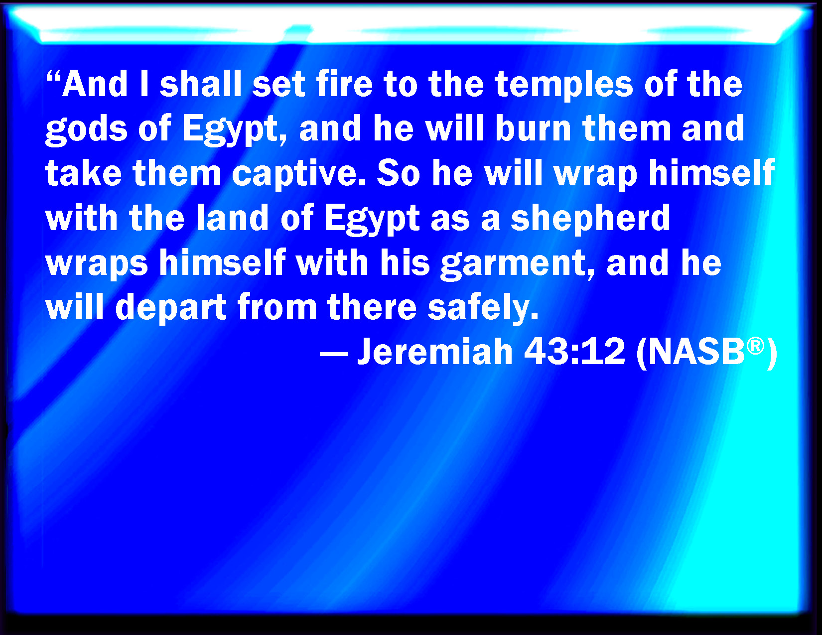 Bible Verse Slide Jeremiah 43:12 And I will kindle a fire in the houses of the gods of Egypt; and he shall burn them, and carry them away captives: and he shall array himself with the land of Egypt, as a shepherd puts on his garment; and he shall go forth from there in peace. KJV: And I will kindle a fire in the houses of the gods of Egypt; and he shall burn them, and carry them away captives: and he shall array himself with the land of Egypt, as a shepherd putteth on his garment; and he shall go forth from thence in peace. DRB: And he shall kindle a fire in the temples of the gods of Egypt, and he shall burn them, and he shall carry them away captives: and he shall array himself with the land of Egypt, as a shepherd putteth on his garment: and he shall go forth from thence in peace. DBT: And I will kindle a fire in the houses of the gods of Egypt, and he shall burn them, and carry them away captive; and he shall array himself with the land of Egypt, as a shepherd putteth on his garment; and he shall go forth from thence in peace. ERV: And I will kindle a fire in the houses of the gods of Egypt; and he shall burn them, and carry them away captives: and he shall array himself with the land of Egypt, as a shepherd putteth on his garment; and he shall go forth from thence in peace. WBT: And I will kindle a fire in the houses of the gods of Egypt; and he shall burn them, and carry them away captives: and he shall array himself with the land of Egypt, as a shepherd putteth on his garment; and he shall go forth from thence in peace. WEB: I will kindle a fire in the houses of the gods of Egypt; and he shall burn them, and carry them away captive: and he shall array himself with the land of Egypt, as a shepherd puts on his garment; and he shall go forth from there in peace. YLT: And I have kindled a fire in the houses of the gods of Egypt, and it hath burned them, and he hath taken them captive, and covered himself with the land of Egypt, as cover himself doth the shepherd with his garment, and he hath gone forth thence in peace;Links Jeremiah 43:12 NIV • Jeremiah 43:12 NLT • Jeremiah 43:12 ESV • Jeremiah 43:12 NASB • Jeremiah 43:12 KJV • Jeremiah 43:12 Interlinear • Jeremiah 43:12 Commentaries • Jeremiah 43:12 Parallel Texts • Jeremiah 43:12 Bible Apps • Jeremiah 43:12 Parallel • Bible Hub |