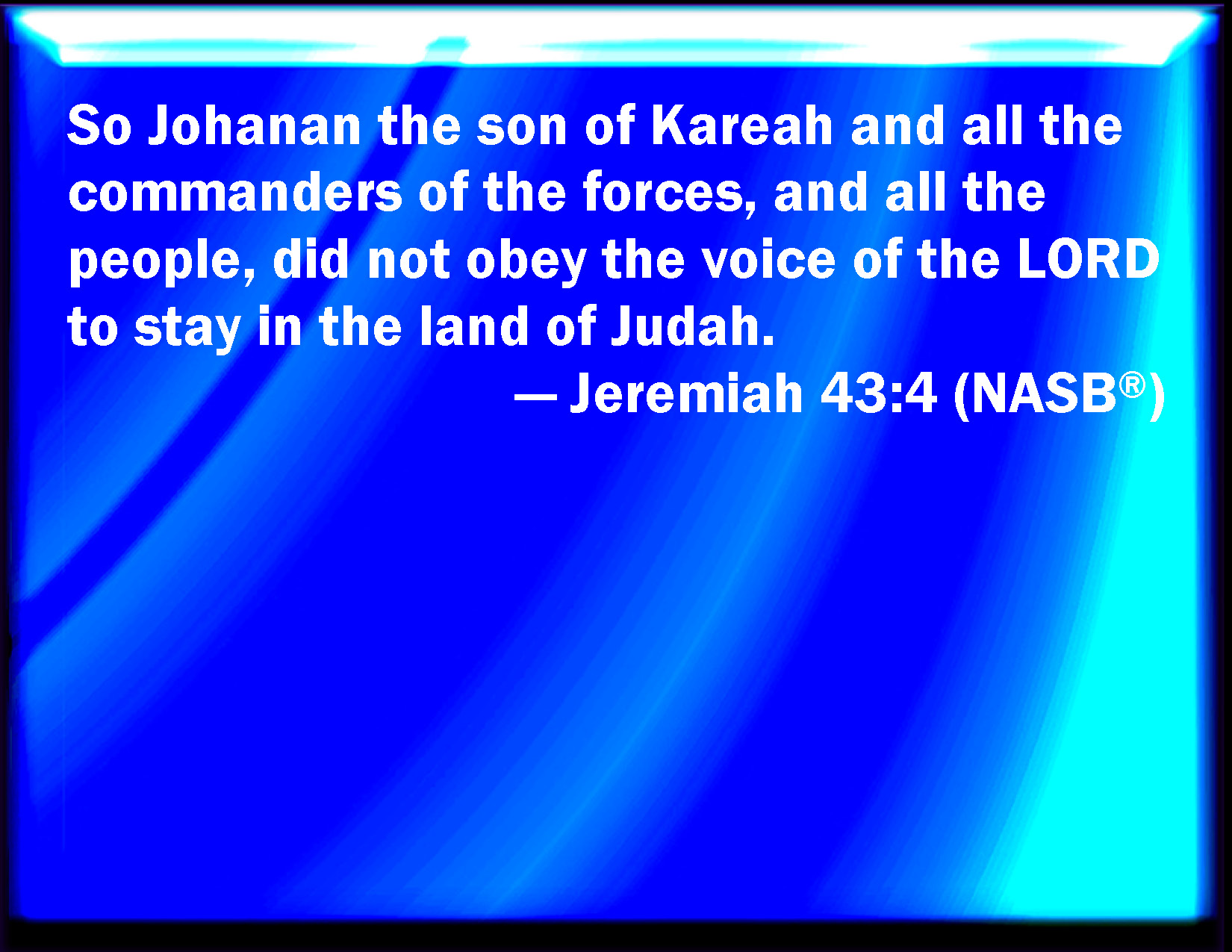 Bible Verse Slide Jeremiah 43:4 So Johanan the son of Kareah, and all the captains of the forces, and all the people, obeyed not the voice of the LORD, to dwell in the land of Judah. KJV: So Johanan the son of Kareah, and all the captains of the forces, and all the people, obeyed not the voice of the LORD, to dwell in the land of Judah. DRB: So Johanan the son of Caree, and all the captains of the soldiers, and all the people, obeyed not the voice of the Lord, to remain in the land of Juda. DBT: So Johanan the son of Kareah, and all the captains of the forces, and all the people, hearkened not unto the voice of Jehovah to abide in the land of Judah; ERV: So Johanan the son of Kareah, and all the captains of the forces, and all the people, obeyed not the voice of the LORD, to dwell in the land of Judah. WBT: So Johanan the son of Kareah, and all the captains of the forces, and all the people, obeyed not the voice of the LORD, to dwell in the land of Judah. WEB: So Johanan the son of Kareah, and all the captains of the forces, and all the people, didn't obey the voice of Yahweh, to dwell in the land of Judah. YLT: And Johanan son of Kareah, and all the heads of the forces, and all the people, have not hearkened to the voice of Jehovah, to dwell in the land of Judah;Links Jeremiah 43:4 NIV • Jeremiah 43:4 NLT • Jeremiah 43:4 ESV • Jeremiah 43:4 NASB • Jeremiah 43:4 KJV • Jeremiah 43:4 Interlinear • Jeremiah 43:4 Commentaries • Jeremiah 43:4 Parallel Texts • Jeremiah 43:4 Bible Apps • Jeremiah 43:4 Parallel • Bible Hub |