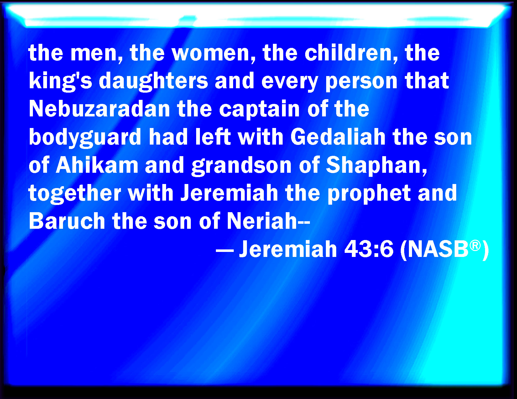 Bible Verse Slide Jeremiah 43:6 Even men, and women, and children, and the king's daughters, and every person that Nebuzaradan the captain of the guard had left with Gedaliah the son of Ahikam the son of Shaphan, and Jeremiah the prophet, and Baruch the son of Neriah. KJV: Even men, and women, and children, and the king's daughters, and every person that Nebuzaradan the captain of the guard had left with Gedaliah the son of Ahikam the son of Shaphan, and Jeremiah the prophet, and Baruch the son of Neriah. DRB: Men, and women, and children, and the king's daughters, and every soul, which Nabuzardan the general had left with Godolias the son of Ahicam the son of Saphan, and Jeremias the prophet, and Baruch the son of Nerias. DBT: men, and women, and children, and the king's daughters, and every person that Nebuzar-adan the captain of the body-guard had left with Gedaliah the son of Ahikam the son of Shaphan, and Jeremiah the prophet, and Baruch the son of Nerijah; ERV: the men, and the women, and the children, and the king's daughters, and every person that Nebuzaradan the captain of the guard had left with Gedaliah the son of Ahikam, the son of Shaphan, and Jeremiah the prophet, and Baruch the son of Neriah; WBT: Even men, and women, and children, and the king's daughters, and every person that Nebuzar-adan the captain of the guard had left with Gedaliah the son of Ahikam the son of Shaphan, and Jeremiah the prophet, and Baruch the son of Neriah. WEB: the men, and the women, and the children, and the king's daughters, and every person who Nebuzaradan the captain of the guard had left with Gedaliah the son of Ahikam, the son of Shaphan; and Jeremiah the prophet, and Baruch the son of Neriah; YLT: the men, and the women, and the infant, and the daughters of the king, and every person that Nebuzar-Adan, chief of the executioners, had left with Gedaliah son of Ahikam, son of Shaphan, and Jeremiah the prophet, and Baruch son of Neriah,Links Jeremiah 43:6 NIV • Jeremiah 43:6 NLT • Jeremiah 43:6 ESV • Jeremiah 43:6 NASB • Jeremiah 43:6 KJV • Jeremiah 43:6 Interlinear • Jeremiah 43:6 Commentaries • Jeremiah 43:6 Parallel Texts • Jeremiah 43:6 Bible Apps • Jeremiah 43:6 Parallel • Bible Hub |