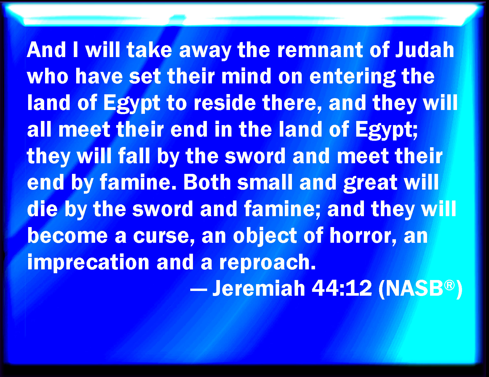Bible Verse Slide Jeremiah 44:12 And I will take the remnant of Judah, that have set their faces to go into the land of Egypt to sojourn there, and they shall all be consumed, and fall in the land of Egypt; they shall even be consumed by the sword and by the famine: they shall die, from the least even to the greatest, by the sword and by the famine: and they shall be an execration, and an astonishment, and a curse, and a reproach. KJV: And I will take the remnant of Judah, that have set their faces to go into the land of Egypt to sojourn there, and they shall all be consumed, and fall in the land of Egypt; they shall even be consumed by the sword and by the famine: they shall die, from the least even unto the greatest, by the sword and by the famine: and they shall be an execration, and an astonishment, and a curse, and a reproach. DRB: And I will take the remnant of Juda that have set their faces to go into the land of Egypt, and to dwell there: and they shall be all consumed in the land of Egypt: they shall fall by the sword, and by the famine: and they shall be consumed from the least even to the greatest, by the sword, and by the famine shall they die: and they shall be for an execration, and for a wonder, and for a curse, and for a reproach. DBT: And I will take the remnant of Judah, that have set their faces to enter into the land of Egypt to sojourn there, and they shall all be consumed: in the land of Egypt shall they fall; they shall be consumed by the sword and by the famine, from the least even unto the greatest; they shall die by the sword and by the famine, and they shall be an execration, an astonishment, and a curse, and a reproach. ERV: And I will take the remnant of Judah, that have set their faces to go into the land of Egypt to sojourn there, and they shall all be consumed; in the land of Egypt shall they fall; they shall be consumed, by the sword and by the famine; they shall die, from the least even unto the greatest, by the sword and by the famine: and they shall be an execration, and an astonishment, and a curse, and a reproach. WBT: And I will take the remnant of Judah, that have set their faces to go into the land of Egypt to sojourn there, and they shall all be consumed, and fall in the land of Egypt; they shall even be consumed by the sword and by the famine: they shall die, from the least even to the greatest, by the sword and by the famine: and they shall be an execration, and an astonishment, and a curse, and a reproach. WEB: I will take the remnant of Judah, that have set their faces to go into the land of Egypt to live there, and they shall all be consumed; in the land of Egypt shall they fall; they shall be consumed by the sword and by the famine; they shall die, from the least even to the greatest, by the sword and by the famine; and they shall be an object of horror, [and] an astonishment, and a curse, and a reproach. YLT: and I have taken the remnant of Judah, who have set their faces to enter the land of Egypt to sojourn there, and they have all been consumed in the land of Egypt; they fall by sword, by famine they are consumed, from the least even unto the greatest, by sword and by famine they die, and they have been for an execration, for an astonishment, and for a reviling, and for a reproach.Links Jeremiah 44:12 NIV • Jeremiah 44:12 NLT • Jeremiah 44:12 ESV • Jeremiah 44:12 NASB • Jeremiah 44:12 KJV • Jeremiah 44:12 Interlinear • Jeremiah 44:12 Commentaries • Jeremiah 44:12 Parallel Texts • Jeremiah 44:12 Bible Apps • Jeremiah 44:12 Parallel • Bible Hub |