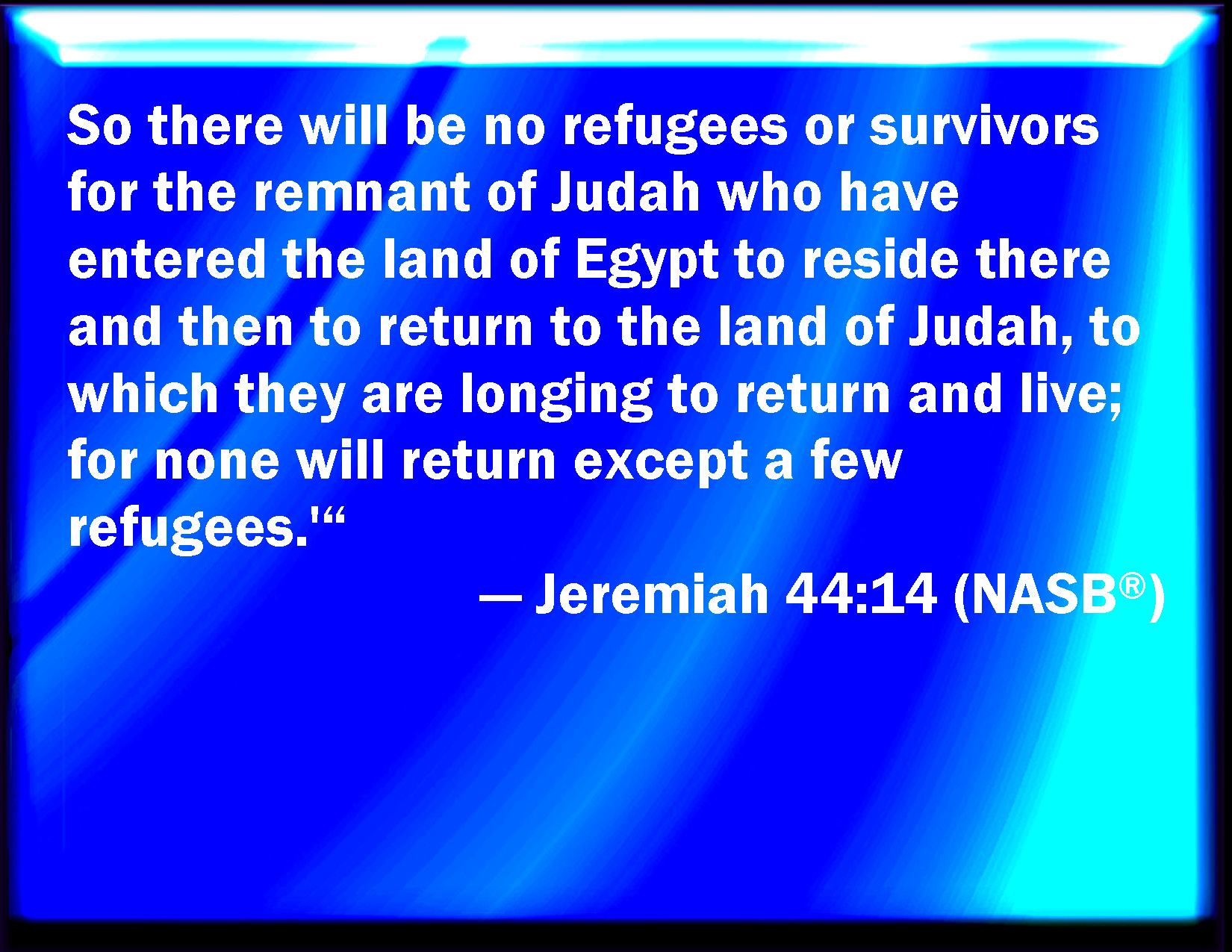 Bible Verse Slide Jeremiah 44:14 So that none of the remnant of Judah, which are gone into the land of Egypt to sojourn there, shall escape or remain, that they should return into the land of Judah, to the which they have a desire to return to dwell there: for none shall return but such as shall escape. KJV: So that none of the remnant of Judah, which are gone into the land of Egypt to sojourn there, shall escape or remain, that they should return into the land of Judah, to the which they have a desire to return to dwell there: for none shall return but such as shall escape. DRB: And there shall be none that shall escape, and remain of the remnant of the Jews that are gone to sojourn in the land of Egypt: and that shall return into the land of Juda, to which they have a desire to return to dwell there: there shall none return but they that shall flee. DBT: and none of the remnant of Judah, that have come into the land of Egypt to sojourn there, shall escape or remain, so as to return into the land of Judah, whither they have a desire to return to dwell there; for none shall return but such as shall escape. ERV: so that none of the remnant of Judah, which are gone into the land of Egypt to sojourn there, shall escape or remain, that they should return into the land of Judah, to the which they have a desire to return to dwell there: for none shall return save such as shall escape. WBT: So that none of the remnant of Judah, who have gone into the land of Egypt, to sojourn there, shall escape or remain, that they should return into the land of Judah, to which they have a desire to return to dwell there: for none shall return but such as shall escape. WEB: so that none of the remnant of Judah, who have gone into the land of Egypt to live there, shall escape or be left, to return into the land of Judah, to which they have a desire to return to dwell there: for none shall return save such as shall escape. YLT: and there is not an escaped and remaining one of the remnant of Judah, who are entering into the land of Egypt to sojourn there, even to turn back to the land of Judah, whither they are lifting up their soul to return to dwell, for they do not turn back, except those escaping.'Links Jeremiah 44:14 NIV • Jeremiah 44:14 NLT • Jeremiah 44:14 ESV • Jeremiah 44:14 NASB • Jeremiah 44:14 KJV • Jeremiah 44:14 Interlinear • Jeremiah 44:14 Commentaries • Jeremiah 44:14 Parallel Texts • Jeremiah 44:14 Bible Apps • Jeremiah 44:14 Parallel • Bible Hub |