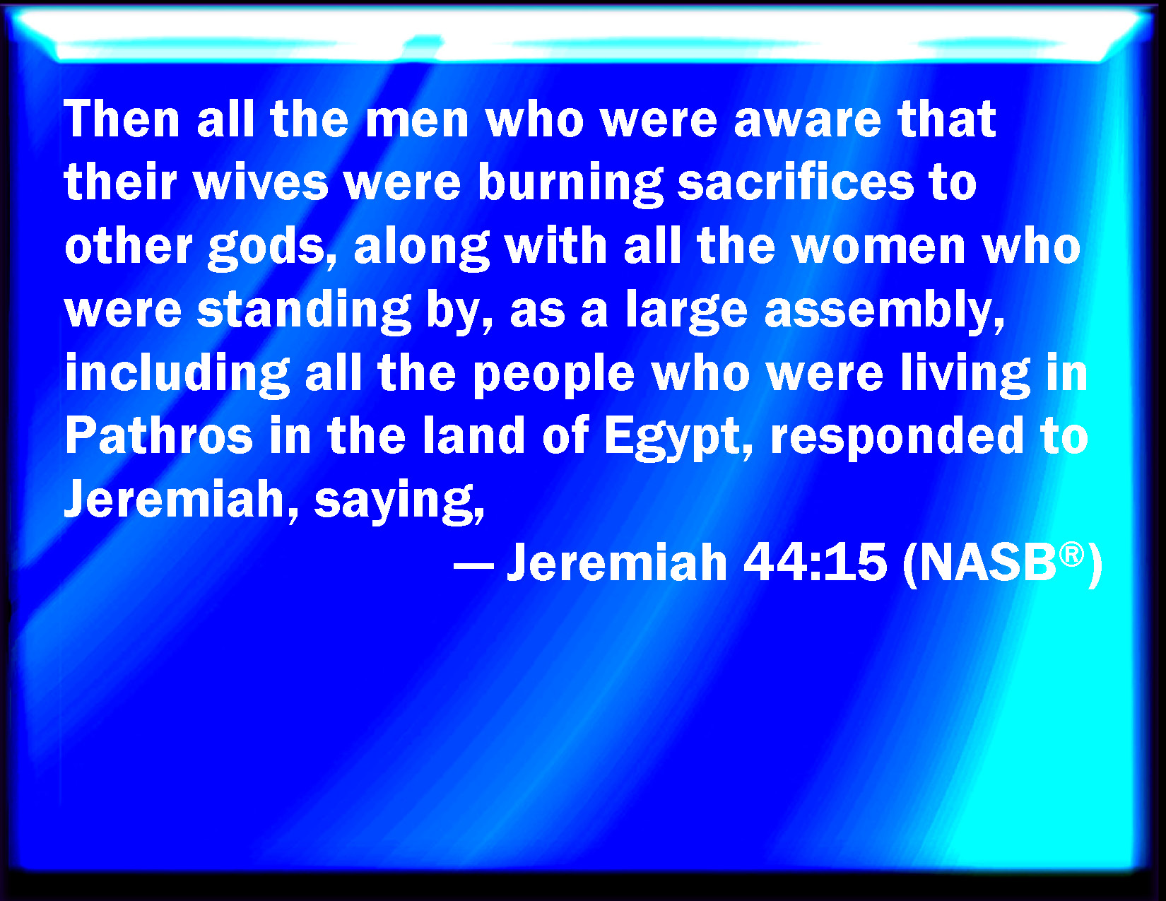 Bible Verse Slide Jeremiah 44:15 Then all the men which knew that their wives had burned incense to other gods, and all the women that stood by, a great multitude, even all the people that dwelled in the land of Egypt, in Pathros, answered Jeremiah, saying, KJV: Then all the men which knew that their wives had burned incense unto other gods, and all the women that stood by, a great multitude, even all the people that dwelt in the land of Egypt, in Pathros, answered Jeremiah, saying, DRB: Then all the men that knew that their wives sacrificed to other gods: and all the women of whom there stood by a great multitude, and all the people of them that dwelt in the land of Egypt in Phatures, answered Jeremias, saying: DBT: Then all the men who knew that their wives burned incense to other gods, and all the women who stood by, a great assemblage, even all the people that dwelt in the land of Egypt, in Pathros, answered Jeremiah, saying, ERV: Then all the men which knew that their wives burned incense unto other gods, and all the women that stood by, a great assembly, even all the people that dwelt in the land of Egypt, in Pathros, answered Jeremiah, saying, WBT: Then all the men who knew that their wives had burned incense to other gods, and all the women that stood by, a great multitude, even all the people that dwelt in the land of Egypt, in Pathros, answered Jeremiah, saying, WEB: Then all the men who knew that their wives burned incense to other gods, and all the women who stood by, a great assembly, even all the people who lived in the land of Egypt, in Pathros, answered Jeremiah, saying, YLT: And they answer Jeremiah — all the men who are knowing that their wives are making perfume to other gods, and all the women who are remaining, a great assembly, even all the people who are dwelling in the land of Egypt, in Pathros — saying:Links Jeremiah 44:15 NIV • Jeremiah 44:15 NLT • Jeremiah 44:15 ESV • Jeremiah 44:15 NASB • Jeremiah 44:15 KJV • Jeremiah 44:15 Interlinear • Jeremiah 44:15 Commentaries • Jeremiah 44:15 Parallel Texts • Jeremiah 44:15 Bible Apps • Jeremiah 44:15 Parallel • Bible Hub |