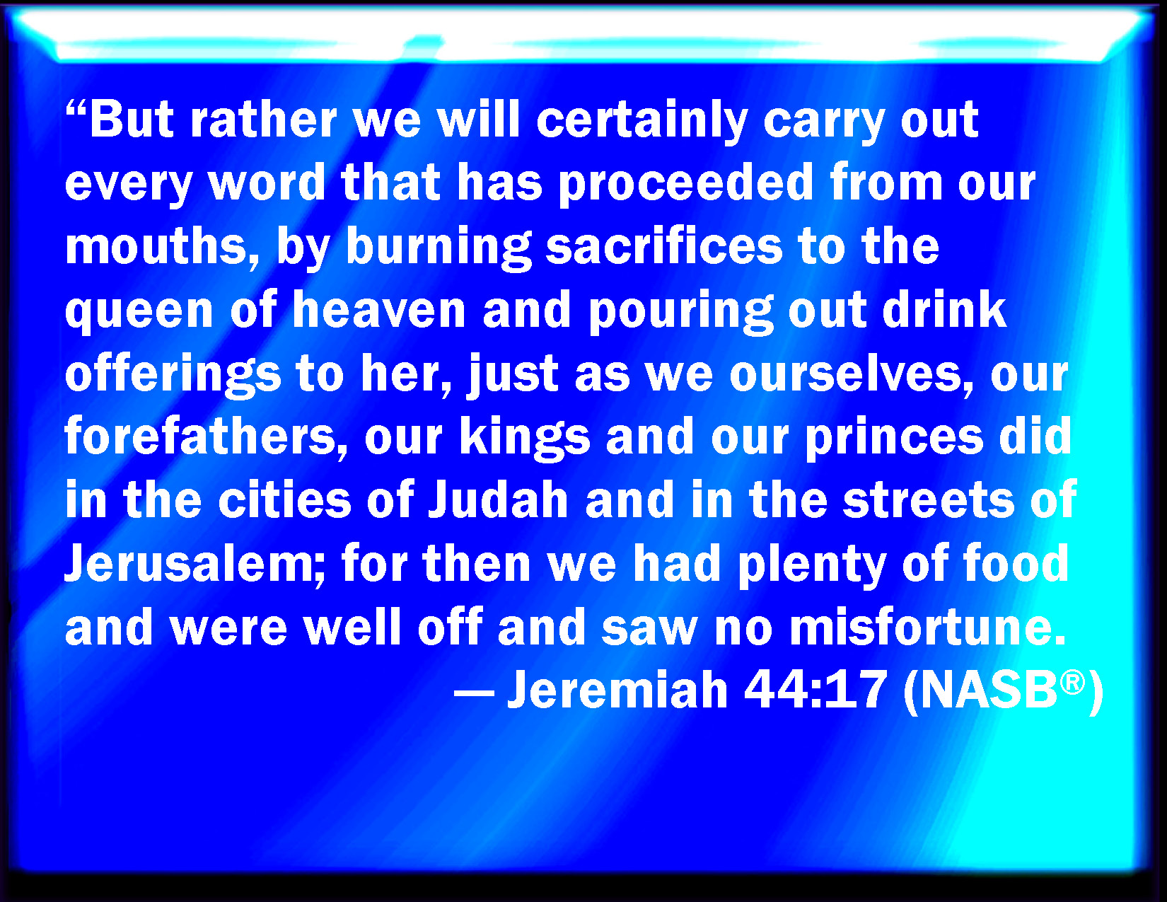 Bible Verse Slide Jeremiah 44:17 But we will certainly do whatever thing goes forth out of our own mouth, to burn incense to the queen of heaven, and to pour out drink offerings to her, as we have done, we, and our fathers, our kings, and our princes, in the cities of Judah, and in the streets of Jerusalem: for then had we plenty of victuals, and were well, and saw no evil. KJV: But we will certainly do whatsoever thing goeth forth out of our own mouth, to burn incense unto the queen of heaven, and to pour out drink offerings unto her, as we have done, we, and our fathers, our kings, and our princes, in the cities of Judah, and in the streets of Jerusalem: for then had we plenty of victuals, and were well, and saw no evil. DRB: But we will certainly do every word that shall proceed out of our own mouth, to sacrifice to the queen of heaven, and to pour out drink offerings to her, as we and our fathers have done, our kings, and our princes in the cities of Juda, and in the streets of Jerusalem: and we were filled with bread, and it was well with us, and we saw no evil. DBT: but we will certainly do every word that is gone forth out of our mouth, to burn incense to the queen of the heavens, and to pour out drink-offerings to her, as we have done, we and our fathers, our kings and our princes, in the cities of Judah and in the streets of Jerusalem; and we had plenty of bread, and were well, and saw no evil. ERV: But we will certainly perform every word that is gone forth out of our mouth, to burn incense unto the queen of heaven, and to pour out drink offerings unto her, as we have done, we and our fathers, our kings and our princes, in the cities of Judah, and in the streets of Jerusalem: for then had we plenty of victuals, and were well, and saw no evil. WBT: But we will certainly do whatever thing proceedeth from our own mouth, to burn incense to the queen of heaven, and to pour out drink-offerings to her, as we have done, we, and our fathers, our kings, and our princes, in the cities of Judah, and in the streets of Jerusalem: for then we had plenty of provisions, and were well, and saw no evil. WEB: But we will certainly perform every word that is gone forth out of our mouth, to burn incense to the queen of the sky, and to pour out drink offerings to her, as we have done, we and our fathers, our kings and our princes, in the cities of Judah, and in the streets of Jerusalem; for then had we plenty of food, and were well, and saw no evil. YLT: for we certainly do everything that hath gone out of our mouth, to make perfume to the queen of the heavens, and to pour out to her libations, as we have done, we, and our fathers, our kings, and our heads, in cities of Judah, and in streets of Jerusalem, and — we are satisfied with bread, and we are well, and evil we have not seen.Links Jeremiah 44:17 NIV • Jeremiah 44:17 NLT • Jeremiah 44:17 ESV • Jeremiah 44:17 NASB • Jeremiah 44:17 KJV • Jeremiah 44:17 Interlinear • Jeremiah 44:17 Commentaries • Jeremiah 44:17 Parallel Texts • Jeremiah 44:17 Bible Apps • Jeremiah 44:17 Parallel • Bible Hub |
