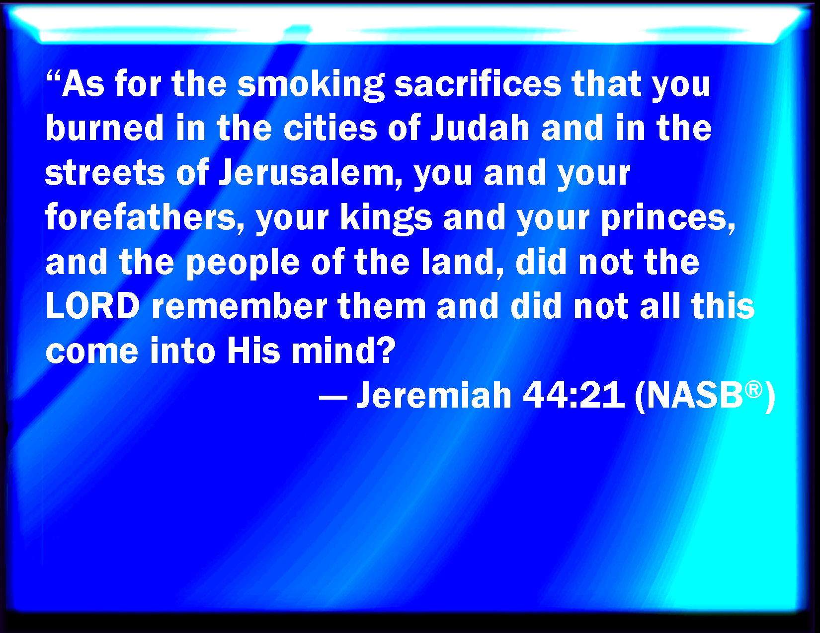 Bible Verse Slide Jeremiah 44:21 The incense that you burned in the cities of Judah, and in the streets of Jerusalem, you, and your fathers, your kings, and your princes, and the people of the land, did not the LORD remember them, and came it not into his mind? KJV: The incense that ye burned in the cities of Judah, and in the streets of Jerusalem, ye, and your fathers, your kings, and your princes, and the people of the land, did not the LORD remember them, and came it not into his mind? DRB: Was it not the sacrifice that you offered in the cities of Juda, and in the streets of Jerusalem, you and Sour fathers, your kings, and your princes, and the people of the land, which the Lord hath remembered, and hath it not entered into his heart? DBT: Is it not the incense that ye burned in the cities of Judah and in the streets of Jerusalem, ye and your fathers, your kings and your princes and the people of the land, that Jehovah remembered, and that came into his mind? ERV: The incense that ye burned in the cities of Judah, and in the streets of Jerusalem, ye and your fathers, your kings and your princes, and the people of the land, did not the LORD remember them, and came it not into his mind? WBT: The incense that ye burned in the cities of Judah, and in the streets of Jerusalem, ye and your fathers, your kings and your princes, and the people of the land, did not the LORD remember them, and came it not into his mind? WEB: The incense that you burned in the cities of Judah, and in the streets of Jerusalem, you and your fathers, your kings and your princes, and the people of the land, didn't Yahweh remember them, and didn't it come into his mind? YLT: 'The perfume that ye made in the cities of Judah, and in the streets of Jerusalem, ye, and your fathers, your kings, and your heads, and the people of the land, hath not Jehovah remembered it? yea, it cometh up on His heart.Links Jeremiah 44:21 NIV • Jeremiah 44:21 NLT • Jeremiah 44:21 ESV • Jeremiah 44:21 NASB • Jeremiah 44:21 KJV • Jeremiah 44:21 Interlinear • Jeremiah 44:21 Commentaries • Jeremiah 44:21 Parallel Texts • Jeremiah 44:21 Bible Apps • Jeremiah 44:21 Parallel • Bible Hub |