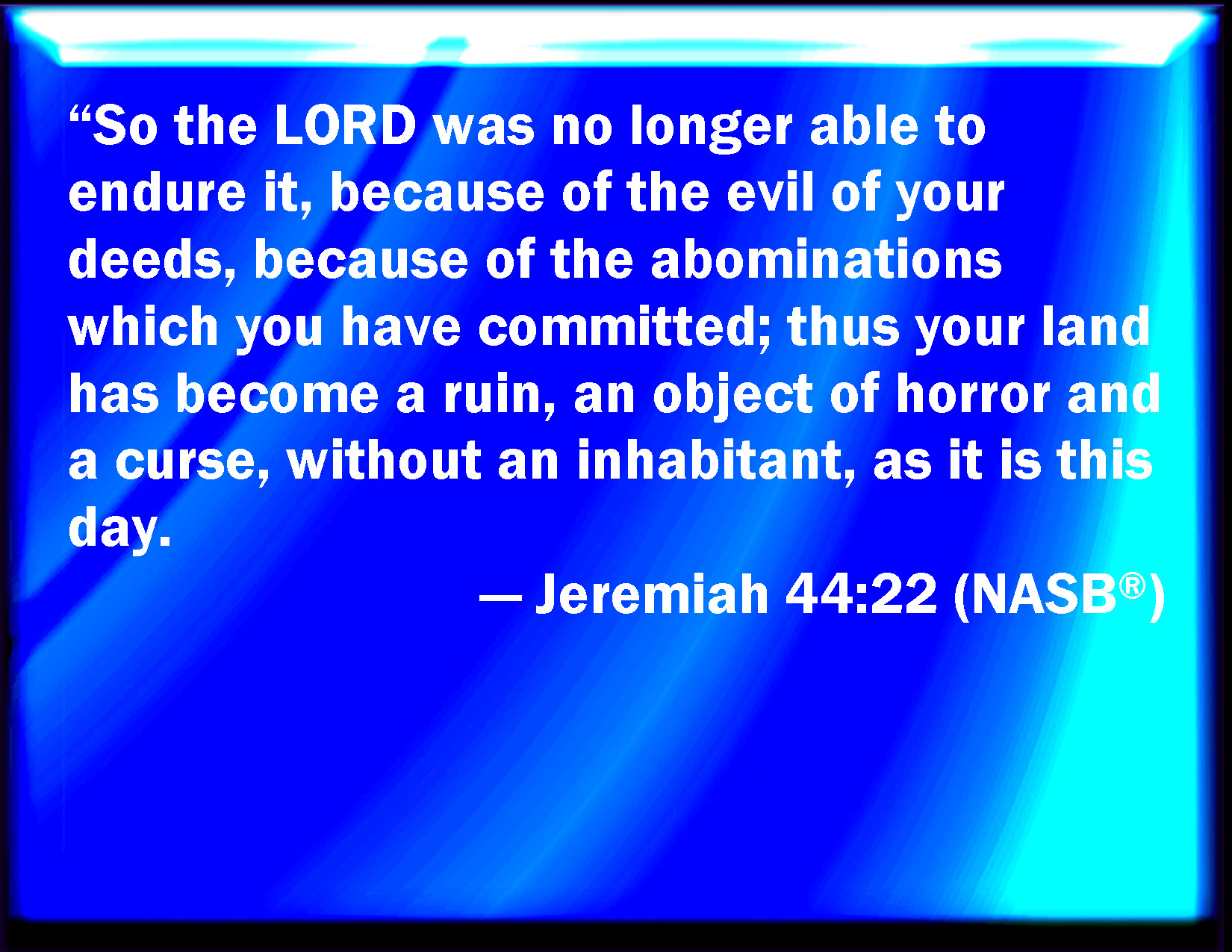 Bible Verse Slide Jeremiah 44:22 So that the LORD could no longer bear, because of the evil of your doings, and because of the abominations which you have committed; therefore is your land a desolation, and an astonishment, and a curse, without an inhabitant, as at this day. KJV: So that the LORD could no longer bear, because of the evil of your doings, and because of the abominations which ye have committed; therefore is your land a desolation, and an astonishment, and a curse, without an inhabitant, as at this day. DRB: So that the Lord could no longer bear, because of the evil of your doings, and because of the abominations which you have committed: therefore your land is become a desolation, and an astonishment, and a curse, without an inhabitant, as at this day. DBT: And Jehovah could no longer bear, because of the evil of your doings, and because of the abominations that ye had committed; and your land is become a waste, and an astonishment, and a curse, without inhabitant, as at this day. ERV: so the LORD could no longer bear, because of the evil of your doings, and because of the abominations which ye have committed; therefore is your land become a desolation, and an astonishment, and a curse, without inhabitant, as it is this day. WBT: So that the LORD could no longer bear, because of the evil of your doings, and because of the abominations which ye have committed; therefore is your land a desolation, and an astonishment, and a curse, without an inhabitant, as at this day. WEB: so that Yahweh could no longer bear, because of the evil of your doings, and because of the abominations which you have committed; therefore your land has become a desolation, and an astonishment, and a curse, without inhabitant, as it is this day. YLT: And Jehovah is not able any more to accept you, because of the evil of your doings, because of the abominations that ye have done, and your land is for a waste, and for an astonishment, and for a reviling, without inhabitant, as at this day.Links Jeremiah 44:22 NIV • Jeremiah 44:22 NLT • Jeremiah 44:22 ESV • Jeremiah 44:22 NASB • Jeremiah 44:22 KJV • Jeremiah 44:22 Interlinear • Jeremiah 44:22 Commentaries • Jeremiah 44:22 Parallel Texts • Jeremiah 44:22 Bible Apps • Jeremiah 44:22 Parallel • Bible Hub |