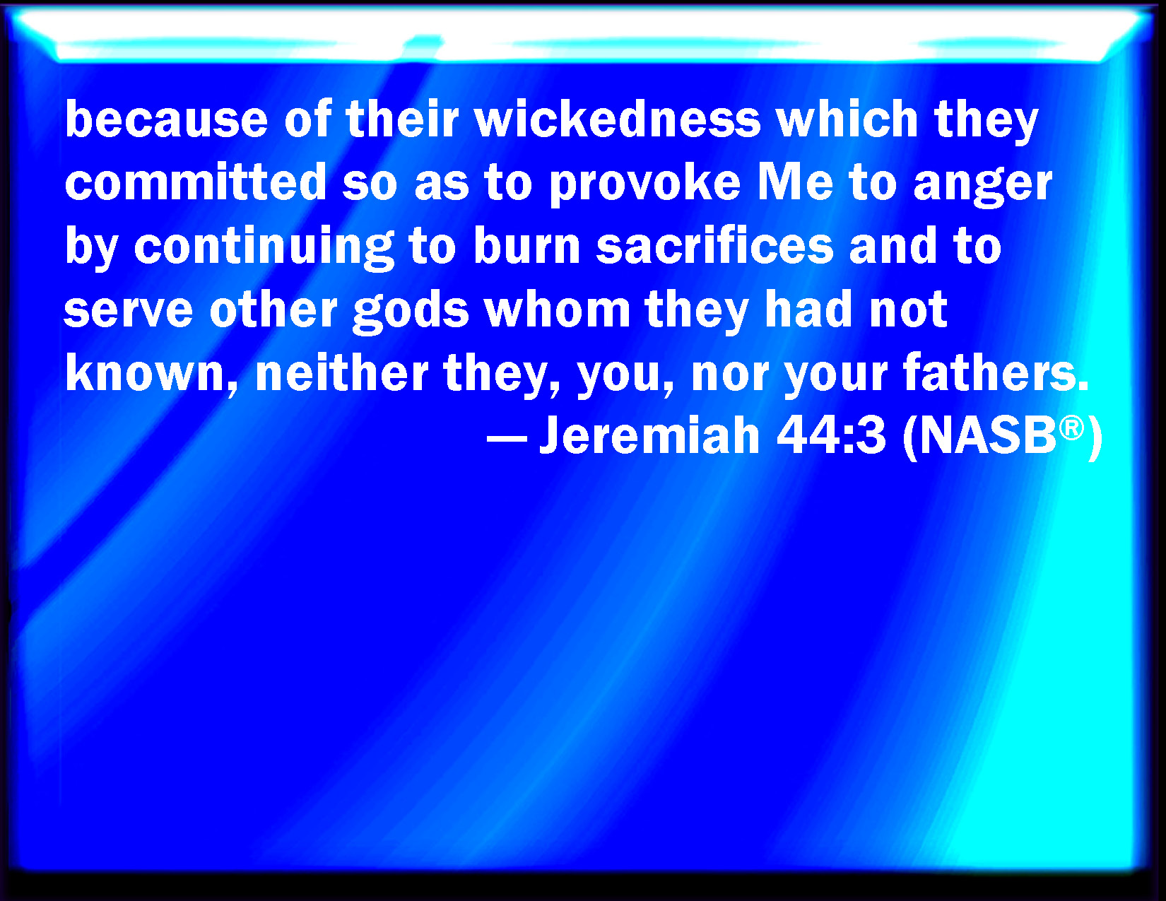 Bible Verse Slide Jeremiah 44:3 Because of their wickedness which they have committed to provoke me to anger, in that they went to burn incense, and to serve other gods, whom they knew not, neither they, you, nor your fathers. KJV: Because of their wickedness which they have committed to provoke me to anger, in that they went to burn incense, and to serve other gods, whom they knew not, neither they, ye, nor your fathers. DRB: Because of the wickedness which they have committed, to provoke me to wrath, and to go and offer sacrifice, and worship other gods, which neither they, nor you, nor your fathers knew. DBT: because of their wickedness which they have committed to provoke me to anger, in that they went to burn incense to serve other gods which they knew not, they, nor ye, nor your fathers. ERV: because of their wickedness which they have committed to provoke me to anger, in that they went to burn incense, and to serve other gods, whom they knew not, neither they, nor ye, nor your fathers. WBT: Because of their wickedness which they have committed to provoke me to anger, in that they went to burn incense, and to serve other gods, whom they knew not, neither they, ye, nor your fathers. WEB: because of their wickedness which they have committed to provoke me to anger, in that they went to burn incense, [and] to serve other gods, that they didn't know, neither they, nor you, nor your fathers. YLT: because of their wickedness that they have done, by provoking Me to anger, by going to make perfume, by serving other gods, that they knew not, they, ye, and your fathers.Links Jeremiah 44:3 NIV • Jeremiah 44:3 NLT • Jeremiah 44:3 ESV • Jeremiah 44:3 NASB • Jeremiah 44:3 KJV • Jeremiah 44:3 Interlinear • Jeremiah 44:3 Commentaries • Jeremiah 44:3 Parallel Texts • Jeremiah 44:3 Bible Apps • Jeremiah 44:3 Parallel • Bible Hub |