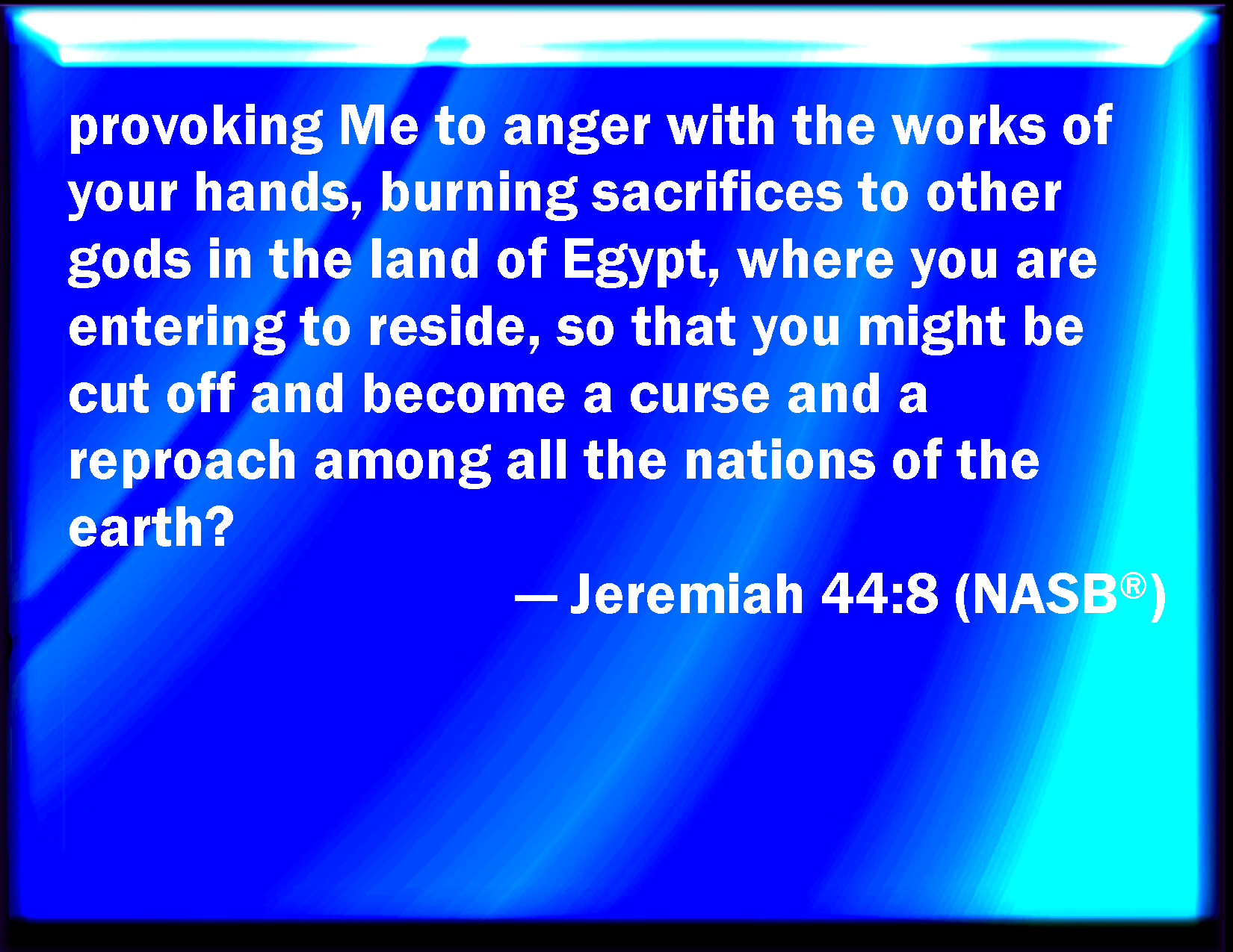 Bible Verse Slide Jeremiah 44:8 In that you provoke me to wrath with the works of your hands, burning incense to other gods in the land of Egypt, where you be gone to dwell, that you might cut yourselves off, and that you might be a curse and a reproach among all the nations of the earth? KJV: In that ye provoke me unto wrath with the works of your hands, burning incense unto other gods in the land of Egypt, whither ye be gone to dwell, that ye might cut yourselves off, and that ye might be a curse and a reproach among all the nations of the earth? DRB: In that you provoke me to wrath with the works of your hands, by sacrificing to other gods in the land of Egypt, into which you are come to dwell there: and that you should perish, and be a curse, and a reproach to all the nations of the earth? DBT: provoking me to anger with the works of your hands, burning incense unto other gods in the land of Egypt, whither ye are come to sojourn, that ye should be cut off, and that ye should be a curse and a reproach among all the nations of the earth? ERV: in that ye provoke me unto anger with the works of your hands, burning incense unto other gods in the land of Egypt, whither ye be gone to sojourn; that ye may be cut off, and that ye may be a curse and a reproach among all the nations of the earth? WBT: In that ye provoke me to wrath with the works of your hands, burning incense to other gods in the land of Egypt, whither ye are gone to dwell, that ye may cut yourselves off, and that ye may be a curse and a reproach among all the nations of the earth? WEB: in that you provoke me to anger with the works of your hands, burning incense to other gods in the land of Egypt, where you have gone to live; that you may be cut off, and that you may be a curse and a reproach among all the nations of the earth? YLT: by provoking Me to anger by the works of your hands, by making perfume to other gods in the land of Egypt, whither ye are going in to sojourn, so as to cut yourselves off, and so as to your being for a reviling and for a reproach among all nations of the earth?Links Jeremiah 44:8 NIV • Jeremiah 44:8 NLT • Jeremiah 44:8 ESV • Jeremiah 44:8 NASB • Jeremiah 44:8 KJV • Jeremiah 44:8 Interlinear • Jeremiah 44:8 Commentaries • Jeremiah 44:8 Parallel Texts • Jeremiah 44:8 Bible Apps • Jeremiah 44:8 Parallel • Bible Hub |