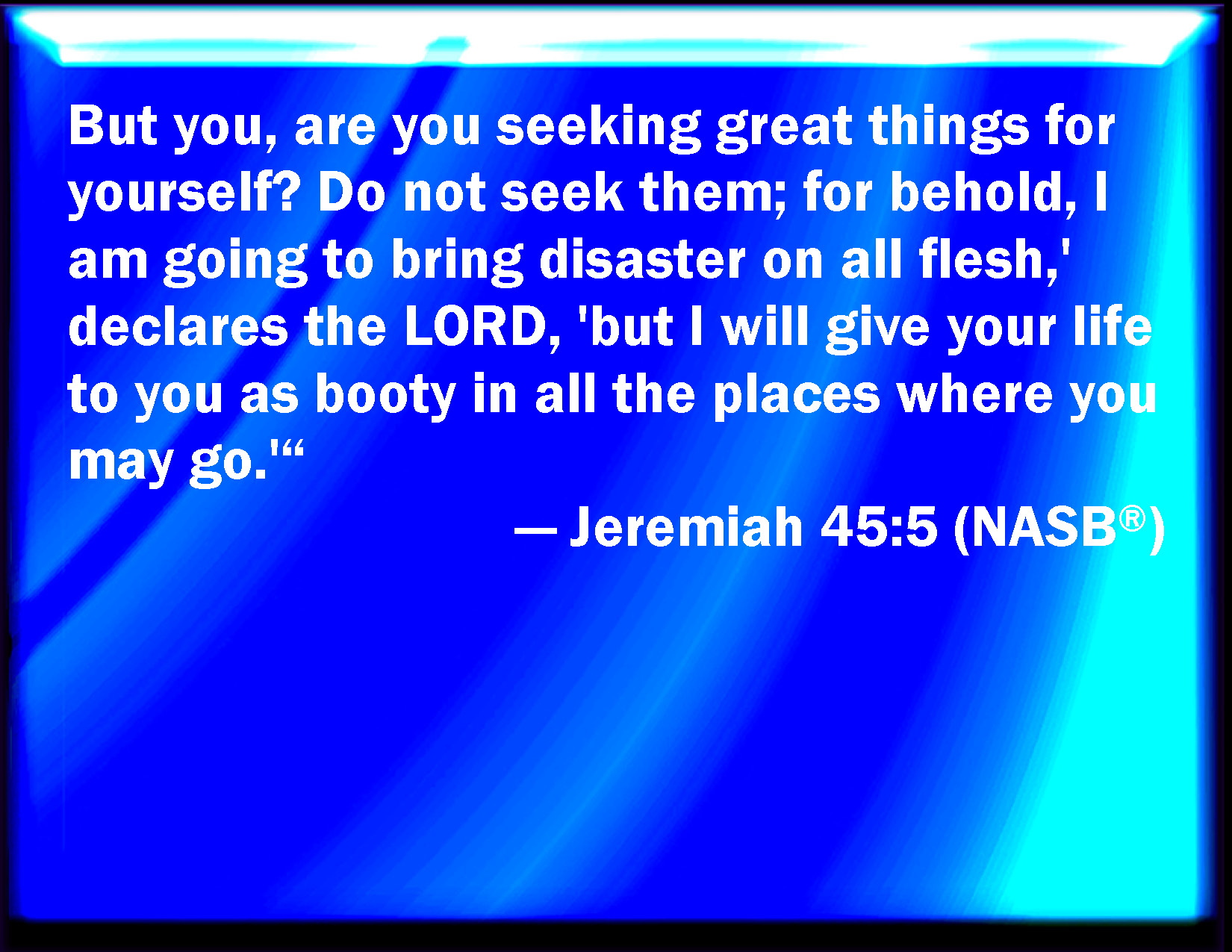 Bible Verse Slide Jeremiah 45:5 And seek you great things for yourself? seek them not: for, behold, I will bring evil on all flesh, said the LORD: but your life will I give to you for a prey in all places where you go. KJV: And seekest thou great things for thyself? seek them not: for, behold, I will bring evil upon all flesh, saith the LORD: but thy life will I give unto thee for a prey in all places whither thou goest. DRB: And dost thou seek great things for thyself ? Seek not : for behold I will bring evil upon all flesh, saith the Lord ! but I will give thee thy life, and save thee in all places whithersoever thou shalt go. DBT: And seekest thou great things for thyself? seek them not; for behold, I will bring evil upon all flesh, saith Jehovah; but thy life will I give unto thee for a prey in all places whither thou shalt go. ERV: And seekest thou great things for thyself? seek them not: for, behold, I will bring evil upon all flesh, saith the LORD: but thy life will I give unto thee for a prey in all places whither thou goest. WBT: And seekest thou great things for thyself? seek them not: for behold, I will bring evil upon all flesh, saith the LORD: but thy life will I give to thee for a prey in all places whither thou goest. WEB: Do you seek great things for yourself? Don't seek them; for, behold, I will bring evil on all flesh, says Yahweh; but your life will I give to you for a prey in all places where you go. YLT: And thou — thou seekest for thee great things — do not seek, for lo, I am bringing in evil on all flesh — an affirmation of Jehovah — and I have given to thee thy life for a spoil, in all places whither thou goest.'Links Jeremiah 45:5 NIV • Jeremiah 45:5 NLT • Jeremiah 45:5 ESV • Jeremiah 45:5 NASB • Jeremiah 45:5 KJV • Jeremiah 45:5 Interlinear • Jeremiah 45:5 Commentaries • Jeremiah 45:5 Parallel Texts • Jeremiah 45:5 Bible Apps • Jeremiah 45:5 Parallel • Bible Hub |
