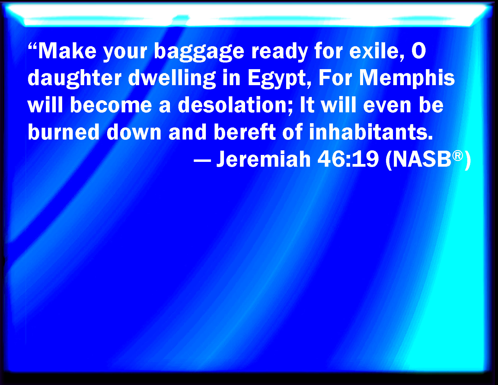 Bible Verse Slide Jeremiah 46:19 O you daughter dwelling in Egypt, furnish yourself to go into captivity: for Noph shall be waste and desolate without an inhabitant. KJV: O thou daughter dwelling in Egypt, furnish thyself to go into captivity: for Noph shall be waste and desolate without an inhabitant. DRB: Furnish thyself to go into captivity, thou daughter inhabitant of Egypt: for Memphis shall be made desolate, and shall be forsaken and uninhabited. DBT: Thou, inhabitress, daughter of Egypt, furnish for thyself a captive's baggage, for Noph shall be a desolation and shall be ruined, so that none shall dwell therein. ERV: O thou daughter that dwellest in Egypt, furnish thyself to go into captivity: for Noph shall become a desolation, and shall be burnt up, without inhabitant. WBT: O thou daughter dwelling in Egypt, furnish thyself to go into captivity: for Noph shall be waste and desolate without an inhabitant. WEB: You daughter who dwells in Egypt, furnish yourself to go into captivity; for Memphis shall become a desolation, and shall be burnt up, without inhabitant. YLT: Goods for removal make for thee, O inhabitant, daughter of Egypt, For Noph becometh a desolation, And hath been burnt up, without inhabitant.Links Jeremiah 46:19 NIV • Jeremiah 46:19 NLT • Jeremiah 46:19 ESV • Jeremiah 46:19 NASB • Jeremiah 46:19 KJV • Jeremiah 46:19 Interlinear • Jeremiah 46:19 Commentaries • Jeremiah 46:19 Parallel Texts • Jeremiah 46:19 Bible Apps • Jeremiah 46:19 Parallel • Bible Hub |