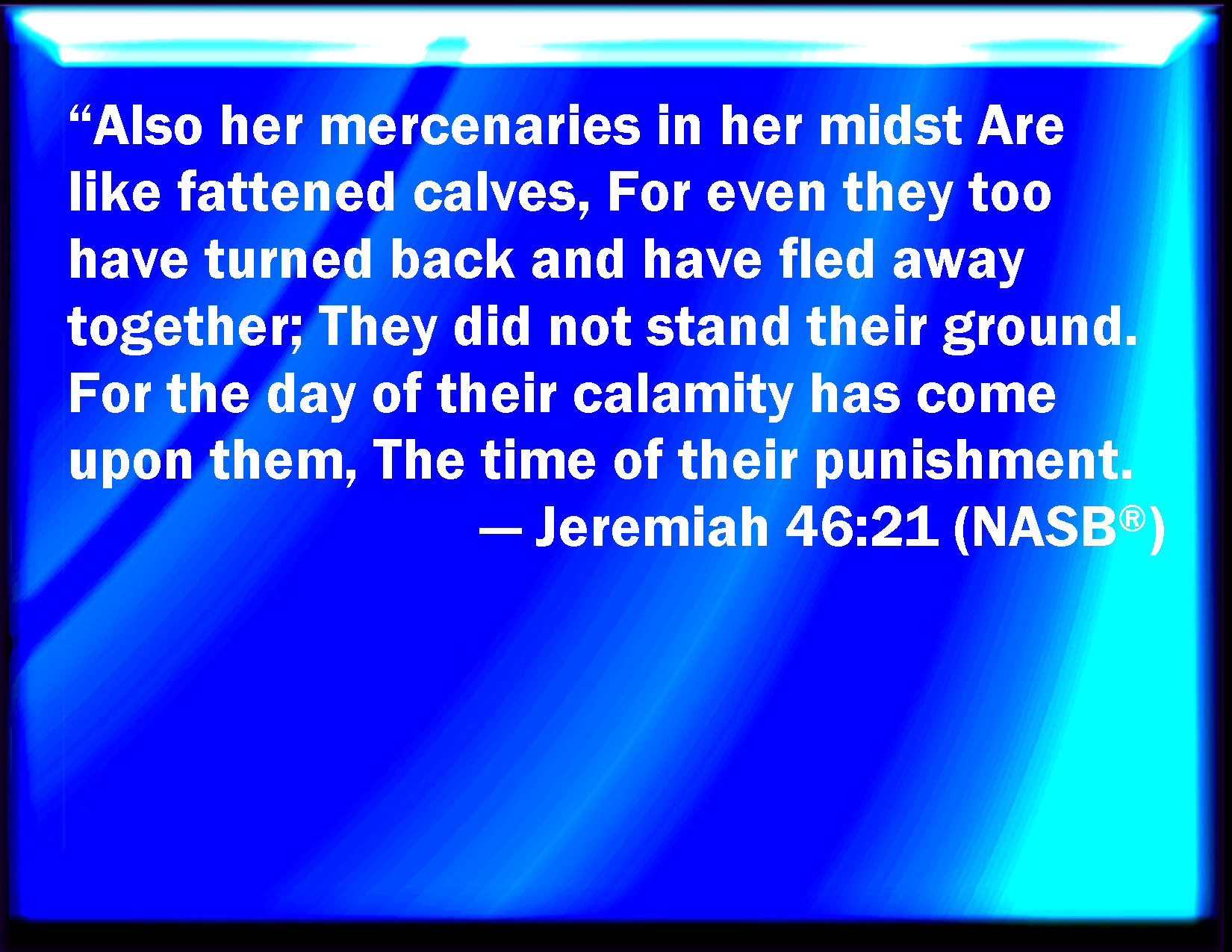 Bible Verse Slide Jeremiah 46:21 Also her hired men are in the middle of her like fatted bullocks; for they also are turned back, and are fled away together: they did not stand, because the day of their calamity was come on them, and the time of their visitation. KJV: Also her hired men are in the midst of her like fatted bullocks; for they also are turned back, and are fled away together: they did not stand, because the day of their calamity was come upon them, and the time of their visitation. DRB: Her hirelings also that lived in the midst of her, like fatted calves are turned back, and are fled away together, and they could not stand, for the day of their slaughter is come upon them, the time of their visitation. DBT: Also her hired men in the midst of her are like fatted bullocks; for they also have turned back, they have fled away together, they did not stand; for the day of their calamity is come upon them, the time of their visitation. ERV: Also her hired men in the midst of her are like calves of the stall; for they also are turned back, they are fled away together, they did not stand: for the day of their calamity is come upon them, the time of their visitation. WBT: Also her hired men are in the midst of her like fatted bullocks; for they also have turned back, and have fled away together: they did not stand, because the day of their calamity had come upon them, and the time of their visitation. WEB: Also her hired men in the midst of her are like calves of the stall; for they also are turned back, they are fled away together, they didn't stand: for the day of their calamity is come on them, the time of their visitation. YLT: Even her hired ones in her midst are as calves of the stall, For even they have turned, They have fled together, they have not stood, For the day of their calamity hath come on them, The time of their inspection.Links Jeremiah 46:21 NIV • Jeremiah 46:21 NLT • Jeremiah 46:21 ESV • Jeremiah 46:21 NASB • Jeremiah 46:21 KJV • Jeremiah 46:21 Interlinear • Jeremiah 46:21 Commentaries • Jeremiah 46:21 Parallel Texts • Jeremiah 46:21 Bible Apps • Jeremiah 46:21 Parallel • Bible Hub |