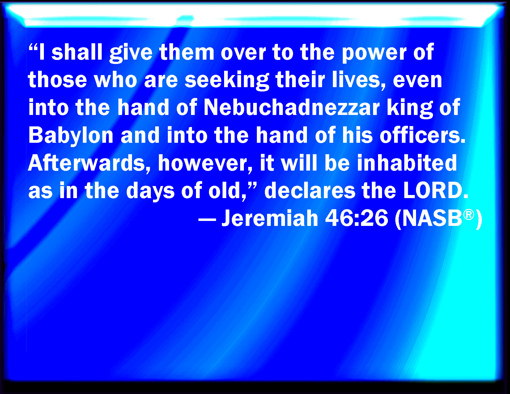 Bible Verse Slide Jeremiah 46:26 And I will deliver them into the hand of those that seek their lives, and into the hand of Nebuchadrezzar king of Babylon, and into the hand of his servants: and afterward it shall be inhabited, as in the days of old, said the LORD. KJV: And I will deliver them into the hand of those that seek their lives, and into the hand of Nebuchadrezzar king of Babylon, and into the hand of his servants: and afterward it shall be inhabited, as in the days of old, saith the LORD. DRB: And I will deliver them into the hand of them that seek their lives, into the hand of Nabuchodonosor king of Babylon, and into the hand of his servants: and afterwards it shall be inhabited, as in the days of old, saith the Lord. DBT: And I will give them into the hand of those that seek their life, and into the hand of Nebuchadrezzar king of Babylon, and into the hand of his servants; but afterwards it shall be inhabited, as in the days of old, saith Jehovah. ERV: and I will deliver them into the hand of those that seek their lives, and into the hand of Nebuchadrezzar king of Babylon, and into the hand of his servants: and afterwards it shall be inhabited, as in the days of old, saith the LORD. WBT: And I will deliver them into the hand of those that seek their lives, and into the hand of Nebuchadrezzar king of Babylon, and into the hand of his servants: and afterward it shall be inhabited, as in the days of old, saith the LORD. WEB: and I will deliver them into the hand of those who seek their lives, and into the hand of Nebuchadnezzar king of Babylon, and into the hand of his servants; and afterwards it shall be inhabited, as in the days of old, says Yahweh. YLT: And I have given them into the hand of those seeking their life, And into the hand of Nebuchadrezzar king of Babylon, And into the hand of his servants, And afterwards it is inhabited, As in days of old — an affirmation of Jehovah.Links Jeremiah 46:26 NIV • Jeremiah 46:26 NLT • Jeremiah 46:26 ESV • Jeremiah 46:26 NASB • Jeremiah 46:26 KJV • Jeremiah 46:26 Interlinear • Jeremiah 46:26 Commentaries • Jeremiah 46:26 Parallel Texts • Jeremiah 46:26 Bible Apps • Jeremiah 46:26 Parallel • Bible Hub |