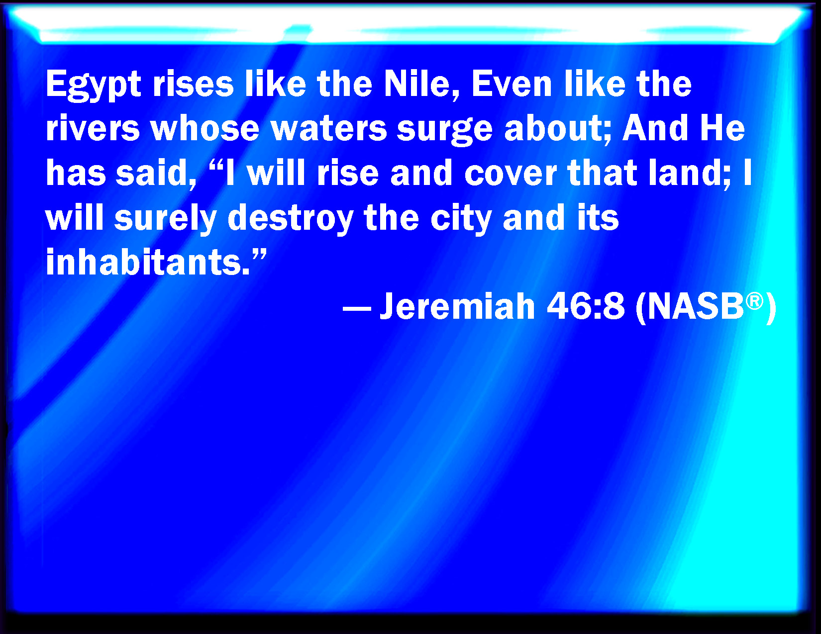 Bible Verse Slide Jeremiah 46:8 Egypt rises up like a flood, and his waters are moved like the rivers; and he said, I will go up, and will cover the earth; I will destroy the city and the inhabitants thereof. KJV: Egypt riseth up like a flood, and his waters are moved like the rivers; and he saith, I will go up, and will cover the earth; I will destroy the city and the inhabitants thereof. DRB: Egypt riseth up like a hood, and the waves thereof shall be moved as rivers, and he shall say: I will go up and will cover the earth: I will destroy the city, and its inhabitants. DBT: It is Egypt that riseth up as the Nile, and his waters toss themselves like the rivers; and he saith, I will rise up, I will cover the earth; I will destroy the city and the inhabitants thereof. ERV: Egypt riseth up like the Nile, and his waters toss themselves like the rivers: and he saith, I will rise up, I will cover the earth; I will destroy the city and the inhabitants thereof. WBT: Egypt riseth up like a flood, and his waters are moved like the rivers; and he saith, I will go up, and will cover the earth; I will destroy the city and its inhabitants. WEB: Egypt rises up like the Nile, and his waters toss themselves like the rivers: and he says, I will rise up, I will cover the earth; I will destroy cities and its inhabitants. YLT: Egypt, as a flood cometh up, And as rivers the waters shake themselves. And he saith, I go up; I cover the land, I destroy the city and the inhabitants in it.Links Jeremiah 46:8 NIV • Jeremiah 46:8 NLT • Jeremiah 46:8 ESV • Jeremiah 46:8 NASB • Jeremiah 46:8 KJV • Jeremiah 46:8 Interlinear • Jeremiah 46:8 Commentaries • Jeremiah 46:8 Parallel Texts • Jeremiah 46:8 Bible Apps • Jeremiah 46:8 Parallel • Bible Hub |