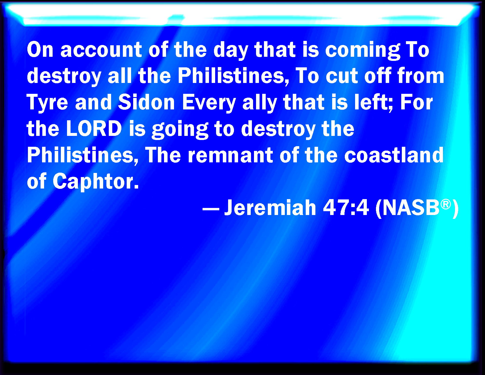 Bible Verse Slide Jeremiah 47:4 Because of the day that comes to spoil all the Philistines, and to cut off from Tyrus and Zidon every helper that remains: for the LORD will spoil the Philistines, the remnant of the country of Caphtor. KJV: Because of the day that cometh to spoil all the Philistines, and to cut off from Tyrus and Zidon every helper that remaineth: for the LORD will spoil the Philistines, the remnant of the country of Caphtor. DRB: Because of the coming of the day, in which all the Philistines shall be laid waste, and Tyre and Sidon shall be destroyed, with all the rest of their helpers. For the Lord hath wasted the Philistines, the remnant of the isle of Cappadocia. DBT: because of the day that cometh to lay waste all the Philistines, to cut off from Tyre and Sidon every helper that remaineth; for Jehovah will lay waste the Philistines, the remnant of the island of Caphtor. ERV: because of the day that cometh to spoil all the Philistines, to cut off from Tyre and Zidon every helper that remaineth: for the LORD will spoil the Philistines, the remnant of the isle of Caphtor. WBT: Because of the day that cometh to lay waste all the Philistines, and to cut off from Tyre and Zidon every helper that remaineth: for the LORD will lay waste the Philistines, the remnant of the country of Caphtor. WEB: because of the day that comes to destroy all the Philistines, to cut off from Tyre and Sidon every helper who remains: for Yahweh will destroy the Philistines, the remnant of the isle of Caphtor. YLT: Because of the day that hath come to spoil all the Philistines, To cut off to Tyre and to Zidon every helping remnant. For Jehovah is spoiling the Philistines, The remnant of the isle of Caphtor.Links Jeremiah 47:4 NIV • Jeremiah 47:4 NLT • Jeremiah 47:4 ESV • Jeremiah 47:4 NASB • Jeremiah 47:4 KJV • Jeremiah 47:4 Interlinear • Jeremiah 47:4 Commentaries • Jeremiah 47:4 Parallel Texts • Jeremiah 47:4 Bible Apps • Jeremiah 47:4 Parallel • Bible Hub |