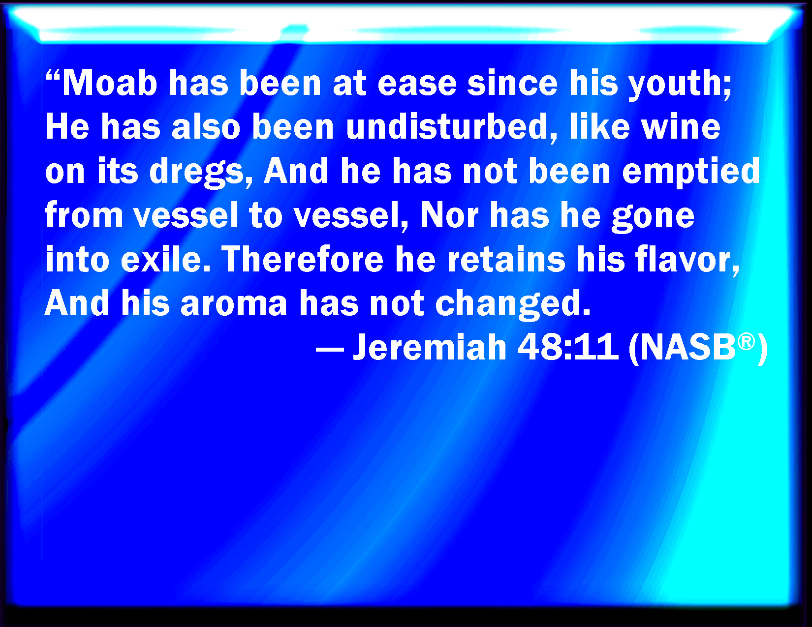 Bible Verse Slide Jeremiah 48:11 Moab has been at ease from his youth, and he has settled on his lees, and has not been emptied from vessel to vessel, neither has he gone into captivity: therefore his taste remained in him, and his scent is not changed. KJV: Moab hath been at ease from his youth, and he hath settled on his lees, and hath not been emptied from vessel to vessel, neither hath he gone into captivity: therefore his taste remained in him, and his scent is not changed. DRB: Moab hath been fruitful from his youth, and hath rested upon his lees: and hath not been poured out from vessel to vessel, nor hath gone into captivity : therefore his taste hath remained in him, and his scent is not changed. DBT: Moab hath been at ease from his youth, and hath settled on his lees; he hath not been emptied from vessel to vessel, neither hath he gone into captivity: therefore his taste hath remained in him, and his scent is not changed. ERV: Moab hath been at ease from his youth, and he hath settled on his lees, and hath not been emptied from vessel to vessel, neither hath he gone into captivity: therefore his taste remaineth in him, and his scent is not changed. WBT: Moab hath been at ease from his youth, and he hath settled on his lees, and hath not been emptied from vessel to vessel, neither hath he gone into captivity: therefore his taste remained in him, and his scent is not changed. WEB: Moab has been at ease from his youth, and he has settled on his lees, and has not been emptied from vessel to vessel, neither has he gone into captivity: therefore his taste remains in him, and his scent is not changed. YLT: Secure is Moab from his youth, And at rest is he for his preserved things, And he hath not been emptied out from vessel unto vessel, And into captivity he hath not gone, Therefore hath his taste remained in him, And his fragrance hath not been changed.Links Jeremiah 48:11 NIV • Jeremiah 48:11 NLT • Jeremiah 48:11 ESV • Jeremiah 48:11 NASB • Jeremiah 48:11 KJV • Jeremiah 48:11 Interlinear • Jeremiah 48:11 Commentaries • Jeremiah 48:11 Parallel Texts • Jeremiah 48:11 Bible Apps • Jeremiah 48:11 Parallel • Bible Hub |