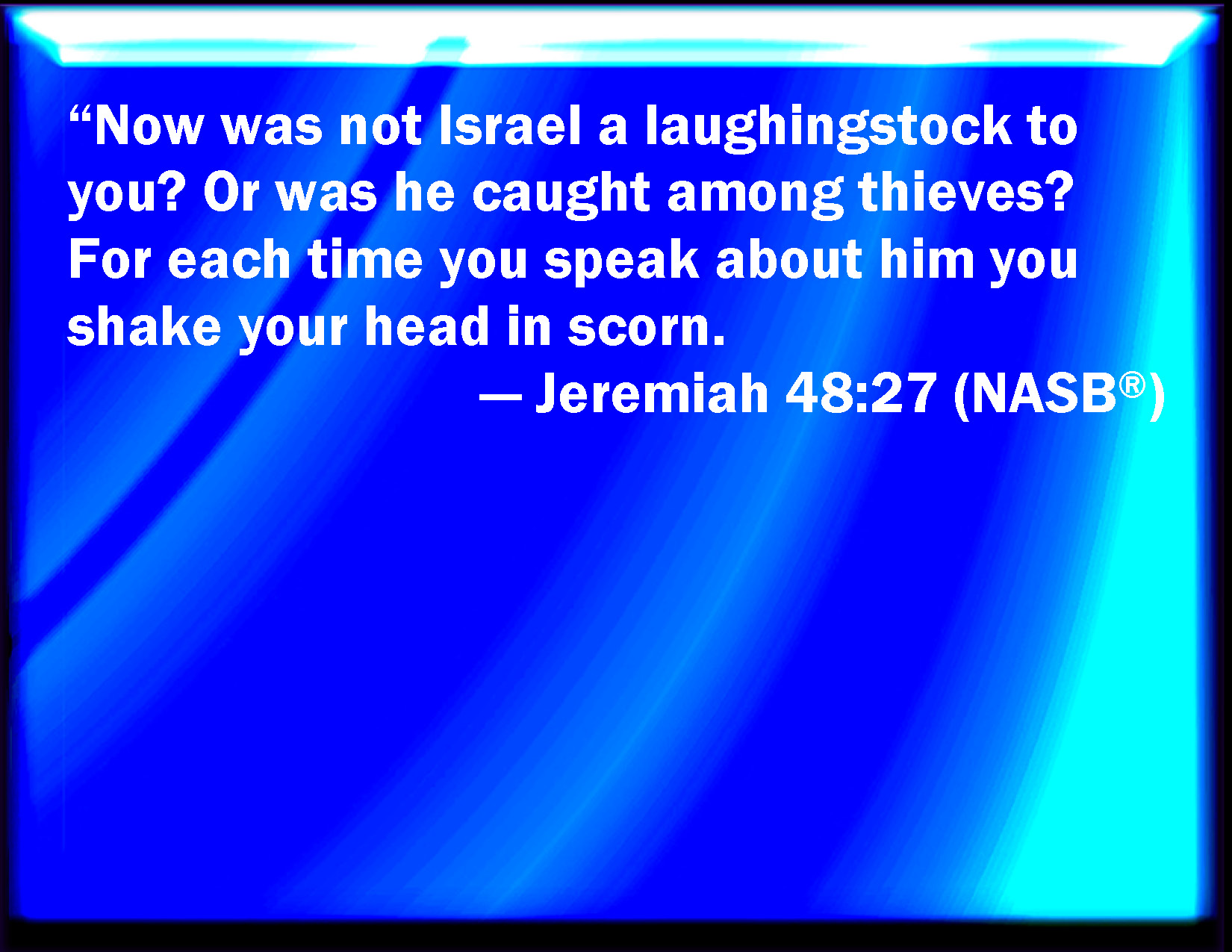Bible Verse Slide Jeremiah 48:27 For was not Israel a derision to you? was he found among thieves? for since you spoke of him, you skipped for joy. KJV: For was not Israel a derision unto thee? was he found among thieves? for since thou spakest of him, thou skippedst for joy. DRB: For Israel hath been a derision unto thee: as though thou hadst found him amongst thieves: for thy words therefore, which thou hast spoken against him, thou shalt be led away captive. DBT: For was not Israel a derision unto thee? Was he found among thieves, that as oft as thou didst speak of him, thou didst shake the head? ERV: For was not Israel a derision unto thee? was he found among thieves? for as often as thou speakest of him, thou waggest the head. WBT: For was not Israel a derision to thee? was he found among thieves? for since thou hast spoken of him, thou hast leaped for joy. WEB: For wasn't Israel a derision to you? was he found among thieves? for as often as you speak of him, you shake your head. YLT: And was not Israel the derision to thee? Among thieves was he found? For since thy words concerning him, Thou dost bemoan thyself.Links Jeremiah 48:27 NIV • Jeremiah 48:27 NLT • Jeremiah 48:27 ESV • Jeremiah 48:27 NASB • Jeremiah 48:27 KJV • Jeremiah 48:27 Interlinear • Jeremiah 48:27 Commentaries • Jeremiah 48:27 Parallel Texts • Jeremiah 48:27 Bible Apps • Jeremiah 48:27 Parallel • Bible Hub |