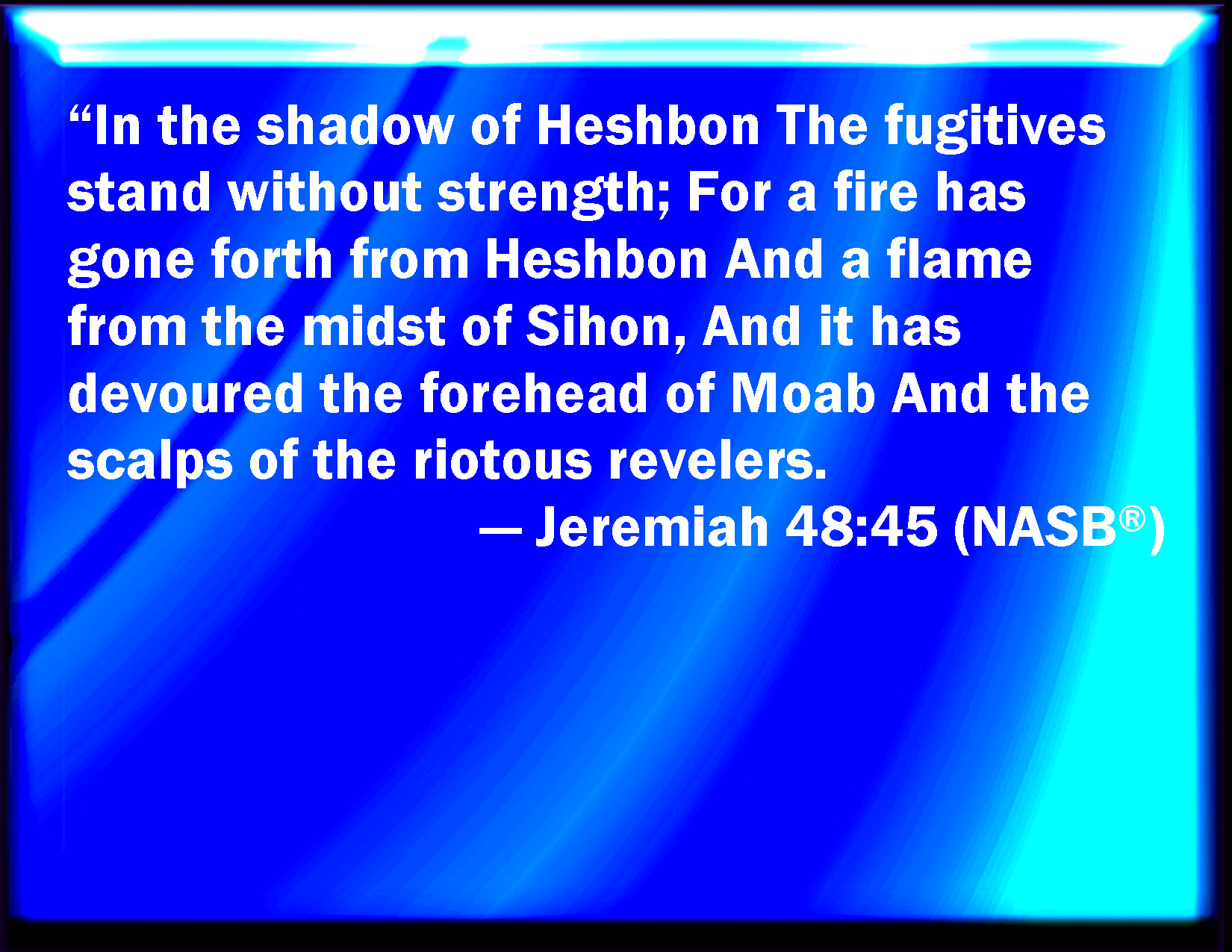 Bible Verse Slide Jeremiah 48:45 They that fled stood under the shadow of Heshbon because of the force: but a fire shall come forth out of Heshbon, and a flame from the middle of Sihon, and shall devour the corner of Moab, and the crown of the head of the tumultuous ones. KJV: They that fled stood under the shadow of Heshbon because of the force: but a fire shall come forth out of Heshbon, and a flame from the midst of Sihon, and shall devour the corner of Moab, and the crown of the head of the tumultuous ones. DRB: They that fled from the snare stood in the shadow of Hesebon: but there came a fire out of Kesebon, and a flame out of the midst of Seen, and it shall devour part of Moab. and the crown of the head of the children of tumult. DBT: They that fled stood under the shadow of Heshbon powerless; for a fire hath come forth from Heshbon, and a flame from the midst of Sihon, and hath consumed the corner of Moab, and the crown of the head of the sons of tumult. ERV: They that fled stand without strength under the shadow of Heshbon: for a fire is gone forth out of Heshbon, and a flame from the midst of Sihon, and hath devoured the corner of Moab, and the crown of the head of the tumultuous ones. WBT: They that fled stood under the shade of Heshbon because of the force: but a fire shall come out of Heshbon, and a flame from the midst of Sihon, and shall devour the corner of Moab, and the crown of the head of the tumultuous ones. WEB: Those who fled stand without strength under the shadow of Heshbon; for a fire is gone forth out of Heshbon, and a flame from the midst of Sihon, and has devoured the corner of Moab, and the crown of the head of the tumultuous ones. YLT: In the shadow of Heshbon stood powerless have fugitives, For fire hath gone forth from Heshbon, And a flame from within Sihon, And it consumeth the corner of Moab, And the crown of the sons of Shaon.Links Jeremiah 48:45 NIV • Jeremiah 48:45 NLT • Jeremiah 48:45 ESV • Jeremiah 48:45 NASB • Jeremiah 48:45 KJV • Jeremiah 48:45 Interlinear • Jeremiah 48:45 Commentaries • Jeremiah 48:45 Parallel Texts • Jeremiah 48:45 Bible Apps • Jeremiah 48:45 Parallel • Bible Hub |