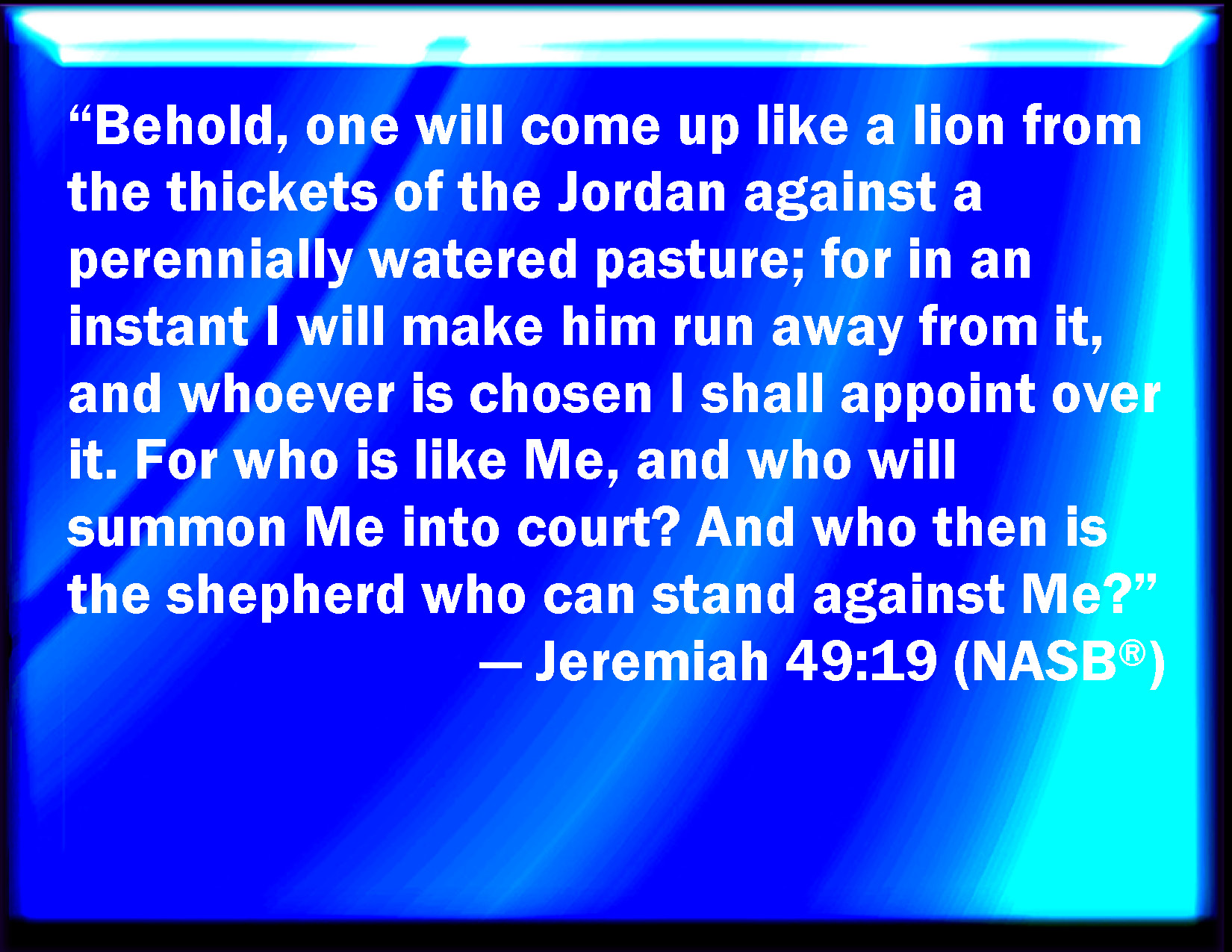 Behold one shall come up as a lion from the swelling of the Jordan, against the strong and beautiful: for I will make him run suddenly upon her: and who shall be the chosen one whom I may appoint over her? for who is like to m? and who shall abide me? and who is that shepherd that can withstand my countenance?