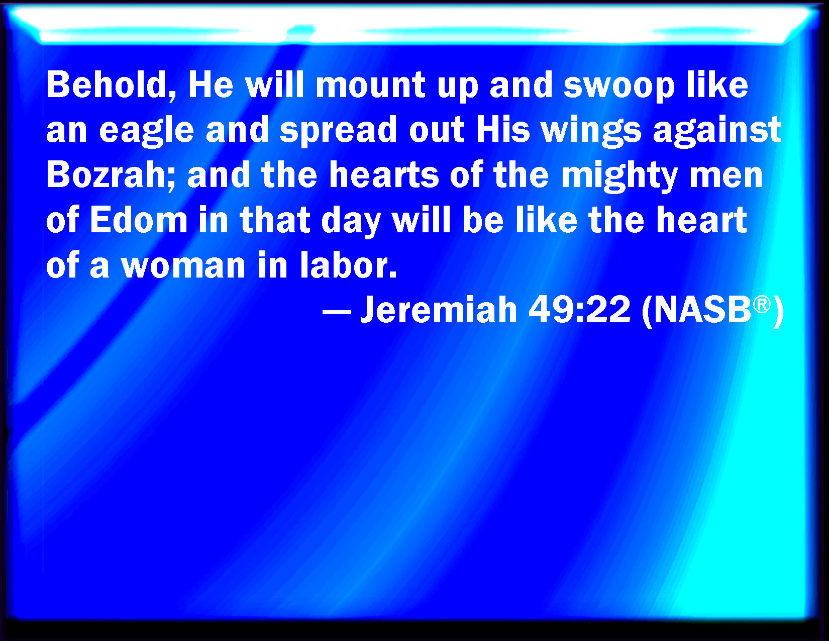 Bible Verse Slide Jeremiah 49:22 Behold, he shall come up and fly as the eagle, and spread his wings over Bozrah: and at that day shall the heart of the mighty men of Edom be as the heart of a woman in her pangs. KJV: Behold, he shall come up and fly as the eagle, and spread his wings over Bozrah: and at that day shall the heart of the mighty men of Edom be as the heart of a woman in her pangs. DRB: Behold he shall come up as an eagle, and fly: and he shall spread his wings over Bosra: and in that day the heart of the valiant ones of Edom shall be as the heart of a woman in labour. DBT: Behold, he shall come up, and fly as an eagle, and spread forth his wings against Bozrah; and at that day the heart of the mighty men of Edom shall be as the heart of a woman in her pangs. ERV: Behold, he shall come up and fly as the eagle, and spread out his wings against Bozrah: and the heart of the mighty men of Edom at that day shall be as the heart of a woman in her pangs. WBT: Behold, he shall come up and fly as the eagle, and spread his wings over Bozrah: and at that day shall the heart of the mighty men of Edom be as the heart of a woman in her pangs. WEB: Behold, he shall come up and fly as the eagle, and spread out his wings against Bozrah: and the heart of the mighty men of Edom at that day shall be as the heart of a woman in her pangs. YLT: Lo, as an eagle he cometh up, and flieth, And he spreadeth his wings over Bozrah, And the heart of the mighty of Edom hath been in that day, As the heart of a distressed woman!'Links Jeremiah 49:22 NIV • Jeremiah 49:22 NLT • Jeremiah 49:22 ESV • Jeremiah 49:22 NASB • Jeremiah 49:22 KJV • Jeremiah 49:22 Interlinear • Jeremiah 49:22 Commentaries • Jeremiah 49:22 Parallel Texts • Jeremiah 49:22 Bible Apps • Jeremiah 49:22 Parallel • Bible Hub |