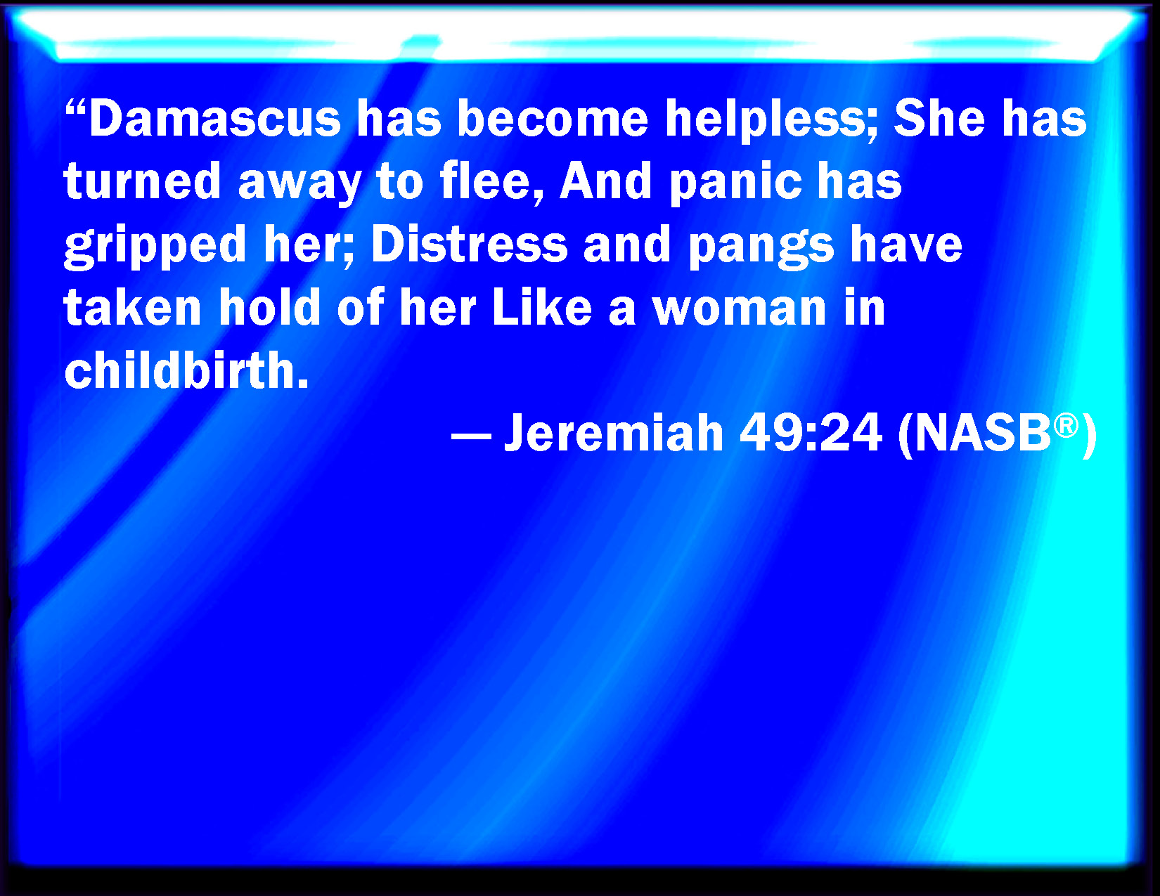 Bible Verse Slide Jeremiah 49:24 Damascus is waxed feeble, and turns herself to flee, and fear has seized on her: anguish and sorrows have taken her, as a woman in travail. KJV: Damascus is waxed feeble, and turneth herself to flee, and fear hath seized on her: anguish and sorrows have taken her, as a woman in travail. DRB: Damascus is undone, she is put to flight, trembling hath seized on her: anguish and sorrows have taken her as a woman in labour. DBT: Damascus is grown feeble: she turneth herself to flee, and terror hath seized on her; trouble and sorrows have taken hold of her as of a woman in travail. ERV: Damascus is waxed feeble, she turneth herself to flee, and trembling hath seized on her: anguish and sorrows have taken hold of her, as of a woman in travail. WBT: Damascus hath become feeble, and turneth herself to flee, and fear hath seized on her: anguish and sorrows have taken her, as a woman in travail. WEB: Damascus has grown feeble, she turns herself to flee, and trembling has seized on her: anguish and sorrows have taken hold of her, as of a woman in travail. YLT: Feeble hath been Damascus, She turned to flee, and fear strengthened her, Distress and pangs have seized her, as a travailing woman.Links Jeremiah 49:24 NIV • Jeremiah 49:24 NLT • Jeremiah 49:24 ESV • Jeremiah 49:24 NASB • Jeremiah 49:24 KJV • Jeremiah 49:24 Interlinear • Jeremiah 49:24 Commentaries • Jeremiah 49:24 Parallel Texts • Jeremiah 49:24 Bible Apps • Jeremiah 49:24 Parallel • Bible Hub |