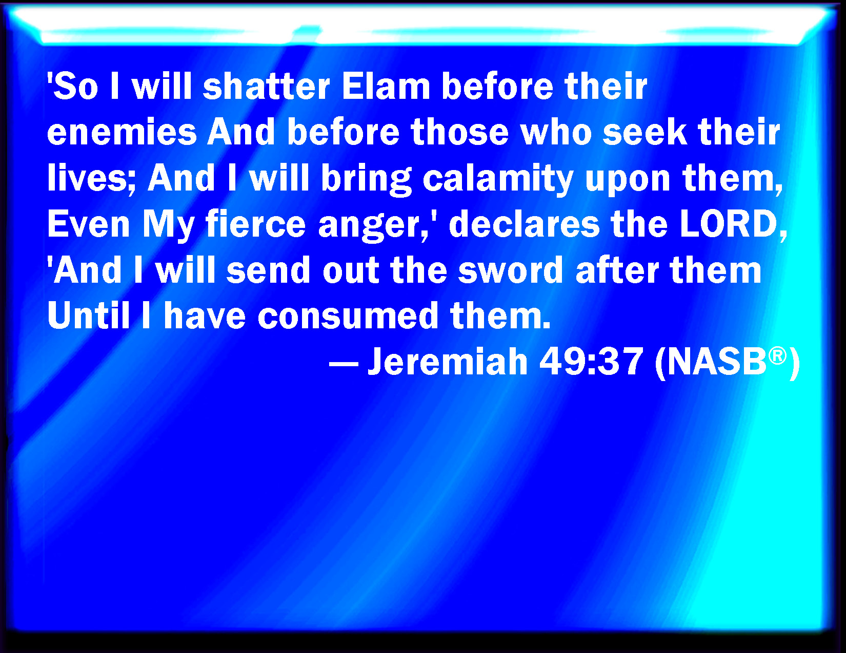 Bible Verse Slide Jeremiah 49:37 For I will cause Elam to be dismayed before their enemies, and before them that seek their life: and I will bring evil on them, even my fierce anger, said the LORD; and I will send the sword after them, till I have consumed them: KJV: For I will cause Elam to be dismayed before their enemies, and before them that seek their life: and I will bring evil upon them, even my fierce anger, saith the LORD; and I will send the sword after them, till I have consumed them: DRB: And I will cause Elam to be afraid before their enemies, and in the sight of them that seek their life: and I will bring evil upon them, my fierce wrath, saith the Lord : and will send the sword after them, till I consume them. DBT: And I will cause Elam to be dismayed before their enemies, and before them that seek their life; and I will bring evil upon them, my fierce anger, saith Jehovah; and I will send the sword after them, till I have consumed them. ERV: And I will cause Elam to be dismayed before their enemies, and before them that seek their life: and I will bring evil upon them, even my fierce anger, saith the LORD; and I will send the sword after them, till I have consumed them: WBT: For I will cause Elam to be dismayed before their enemies, and before them that seek their life: and I will bring evil upon them, even my fierce anger, saith the LORD; and I will send the sword after them, till I have consumed them: WEB: I will cause Elam to be dismayed before their enemies, and before those who seek their life; and I will bring evil on them, even my fierce anger, says Yahweh; and I will send the sword after them, until I have consumed them; YLT: And I have affrighted Elam before their enemies, And before those seeking their life, And I have brought in against them evil, The heat of Mine anger, An affirmation of Jehovah, And I have sent after them the sword, Till I have consumed them;Links Jeremiah 49:37 NIV • Jeremiah 49:37 NLT • Jeremiah 49:37 ESV • Jeremiah 49:37 NASB • Jeremiah 49:37 KJV • Jeremiah 49:37 Interlinear • Jeremiah 49:37 Commentaries • Jeremiah 49:37 Parallel Texts • Jeremiah 49:37 Bible Apps • Jeremiah 49:37 Parallel • Bible Hub |