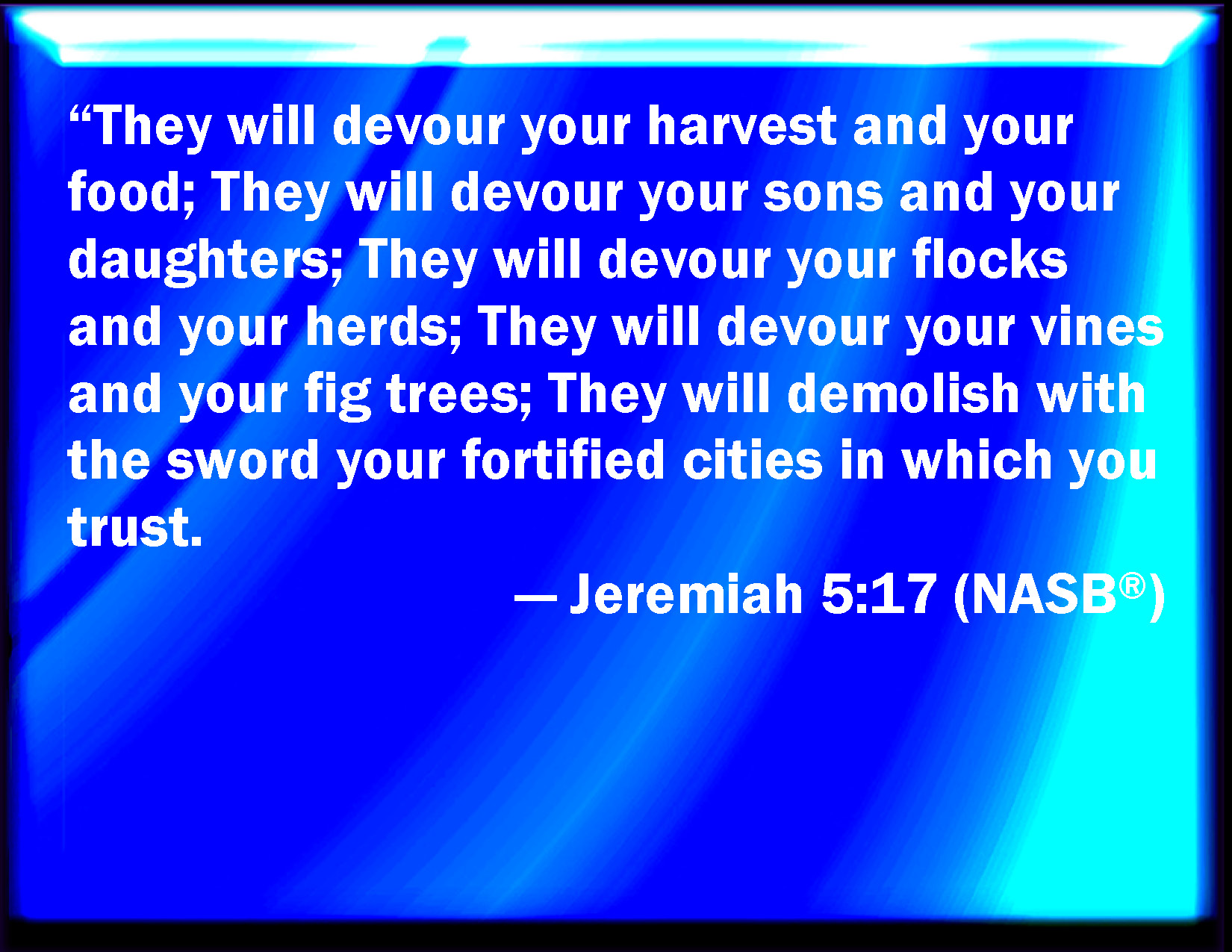 Bible Verse Slide Jeremiah 5:17 And they shall eat up your harvest, and your bread, which your sons and your daughters should eat: they shall eat up your flocks and your herds: they shall eat up your vines and your fig trees: they shall impoverish your fenced cities, wherein you trusted, with the sword. KJV: And they shall eat up thine harvest, and thy bread, which thy sons and thy daughters should eat: they shall eat up thy flocks and thine herds: they shall eat up thy vines and thy fig trees: they shall impoverish thy fenced cities, wherein thou trustedst, with the sword. DRB: And they shall eat up thy corn, and thy bread: they shall devour thy sons, and thy daughters: they shall eat up thy flocks, and thy herds: they shall eat thy vineyards, and thy figs: and with the sword they shall destroy thy strong cities, wherein thou trustest. DBT: And they shall eat up thy harvest and thy bread, they shall eat up thy sons and thy daughters, they shall eat up thy flocks and thy herds, they shall eat up thy vines and thy fig-trees; they shall destroy with the sword thy strong cities, wherein thou trustedst. ERV: And they shall eat up thine harvest and thy bread, which thy sons and thy daughters should eat: they shall eat up thy flocks and thine herds: they shall eat up thy vines and thy fig trees: they shall beat down thy fenced cities, wherein thou trustest, with the sword. WBT: And they shall eat up thy harvest, and thy bread, which thy sons and thy daughters should eat: they shall eat up thy flocks and thy herds: they shall eat up thy vines and thy fig-trees: they shall impoverish with the sword thy fortified cities, in which thou hast trusted. WEB: They shall eat up your harvest, and your bread, [which] your sons and your daughters should eat. They shall eat up your flocks and your herds. They shall eat up your vines and your fig trees. They shall beat down your fortified cities, in which you trust, with the sword. YLT: And it hath consumed thy harvest and thy bread, They consume thy sons, and thy daughters, It consumeth thy flock, and thy herd, It consumeth thy vine, and thy fig-tree, It maketh poor thy fenced cities, In which thou art trusting — by the sword.Links Jeremiah 5:17 NIV • Jeremiah 5:17 NLT • Jeremiah 5:17 ESV • Jeremiah 5:17 NASB • Jeremiah 5:17 KJV • Jeremiah 5:17 Interlinear • Jeremiah 5:17 Commentaries • Jeremiah 5:17 Parallel Texts • Jeremiah 5:17 Bible Apps • Jeremiah 5:17 Parallel • Bible Hub |