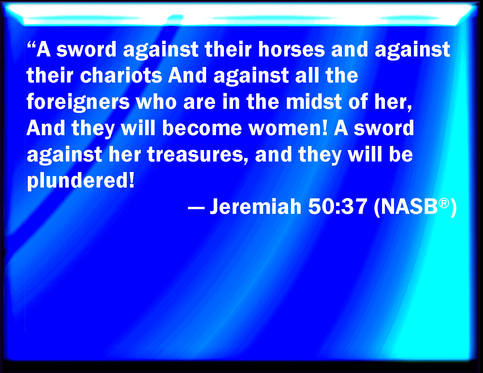 Bible Verse Slide Jeremiah 50:37 A sword is on their horses, and on their chariots, and on all the mingled people that are in the middle of her; and they shall become as women: a sword is on her treasures; and they shall be robbed. KJV: A sword is upon their horses, and upon their chariots, and upon all the mingled people that are in the midst of her; and they shall become as women: a sword is upon her treasures; and they shall be robbed. DRB: A sword upon their horses, and upon their chariots, and upon all the people that are in the midst of her: and they shall become as women: a sword upon her treasures, and they shall be made a spoil. DBT: the sword is upon their horses, and upon their chariots, and upon all the mingled people that are in the midst of her, and they shall become as women; the sword is upon her treasures, and they shall be robbed: ERV: A sword is upon their horse, and upon their chariots, and upon all the mingled people that are in the midst of her, and they shall become as women: a sword is upon her treasures, and they shall be robbed. WBT: A sword is upon their horses, and upon their chariots, and upon all the mingled people that are in the midst of her; and they shall become as women: a sword is upon her treasures; and they shall be robbed. WEB: A sword is on their horses, and on their chariots, and on all the mixed people who are in the midst of her; and they shall become as women: a sword is on her treasures, and they shall be robbed. YLT: A sword is on his horses and on his chariot, And on all the rabble who are in her midst, And they have become women; A sword is on her treasuries, And they have been spoiled;Links Jeremiah 50:37 NIV • Jeremiah 50:37 NLT • Jeremiah 50:37 ESV • Jeremiah 50:37 NASB • Jeremiah 50:37 KJV • Jeremiah 50:37 Interlinear • Jeremiah 50:37 Commentaries • Jeremiah 50:37 Parallel Texts • Jeremiah 50:37 Bible Apps • Jeremiah 50:37 Parallel • Bible Hub |