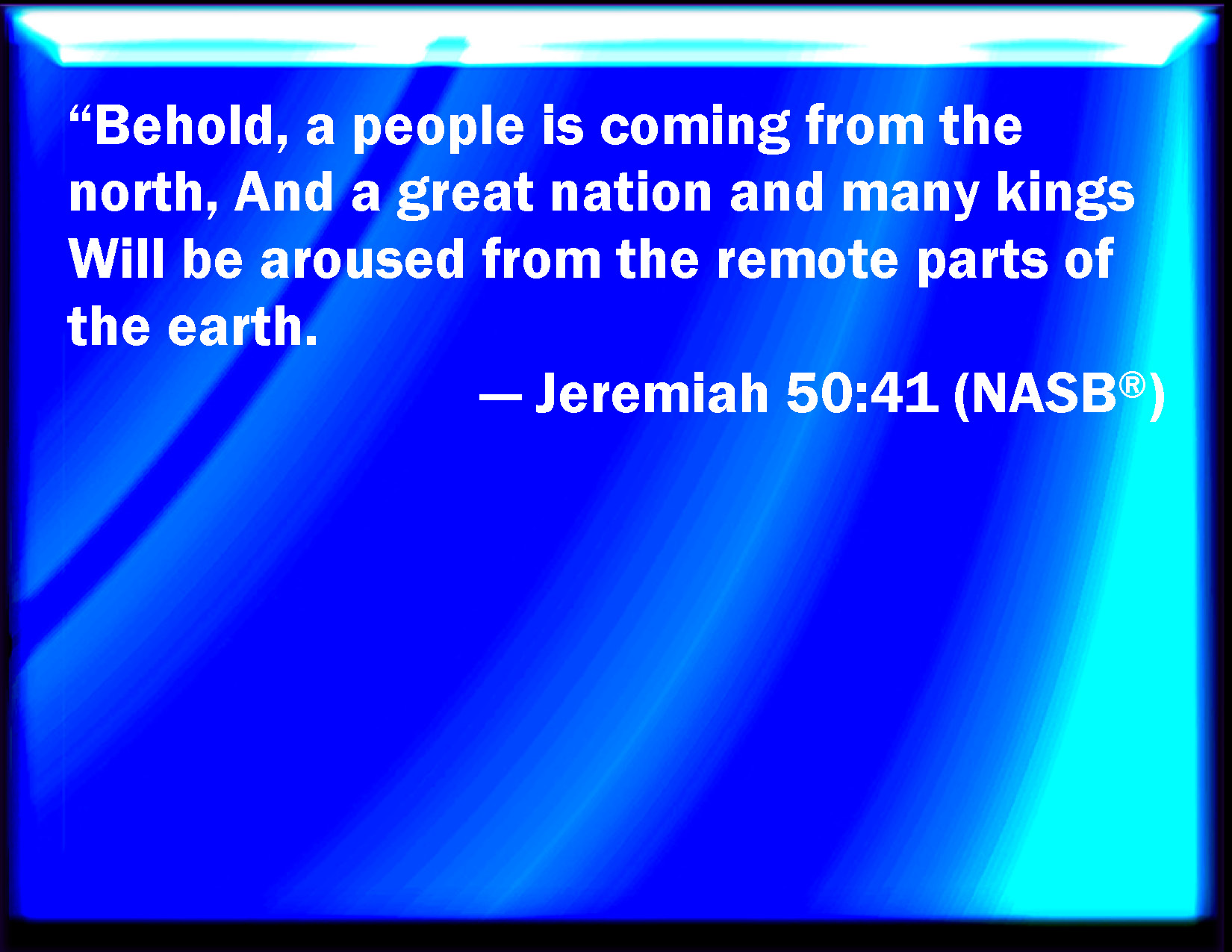 Bible Verse Slide Jeremiah 50:41 Behold, a people shall come from the north, and a great nation, and many kings shall be raised up from the coasts of the earth. KJV: Behold, a people shall come from the north, and a great nation, and many kings shall be raised up from the coasts of the earth. DRB: Behold a people cometh from the north, and a great nation, and many kings shall rise from the ends of the earth. DBT: Behold, a people cometh from the north, and a great nation. And many kings shall arise from the uttermost parts of the earth. ERV: Behold, a people cometh from the north; and a great nation, and many kings shall be stirred up from the uttermost parts of the earth. WBT: Behold, a people shall come from the north, and a great nation, and many kings shall be raised up from the borders of the earth. WEB: Behold, a people comes from the north; and a great nation and many kings shall be stirred up from the uttermost parts of the earth. YLT: Lo, a people hath come from the north, Even a great nation, And many kings are stirred up from the sides of the earth.Links Jeremiah 50:41 NIV • Jeremiah 50:41 NLT • Jeremiah 50:41 ESV • Jeremiah 50:41 NASB • Jeremiah 50:41 KJV • Jeremiah 50:41 Interlinear • Jeremiah 50:41 Commentaries • Jeremiah 50:41 Parallel Texts • Jeremiah 50:41 Bible Apps • Jeremiah 50:41 Parallel • Bible Hub |